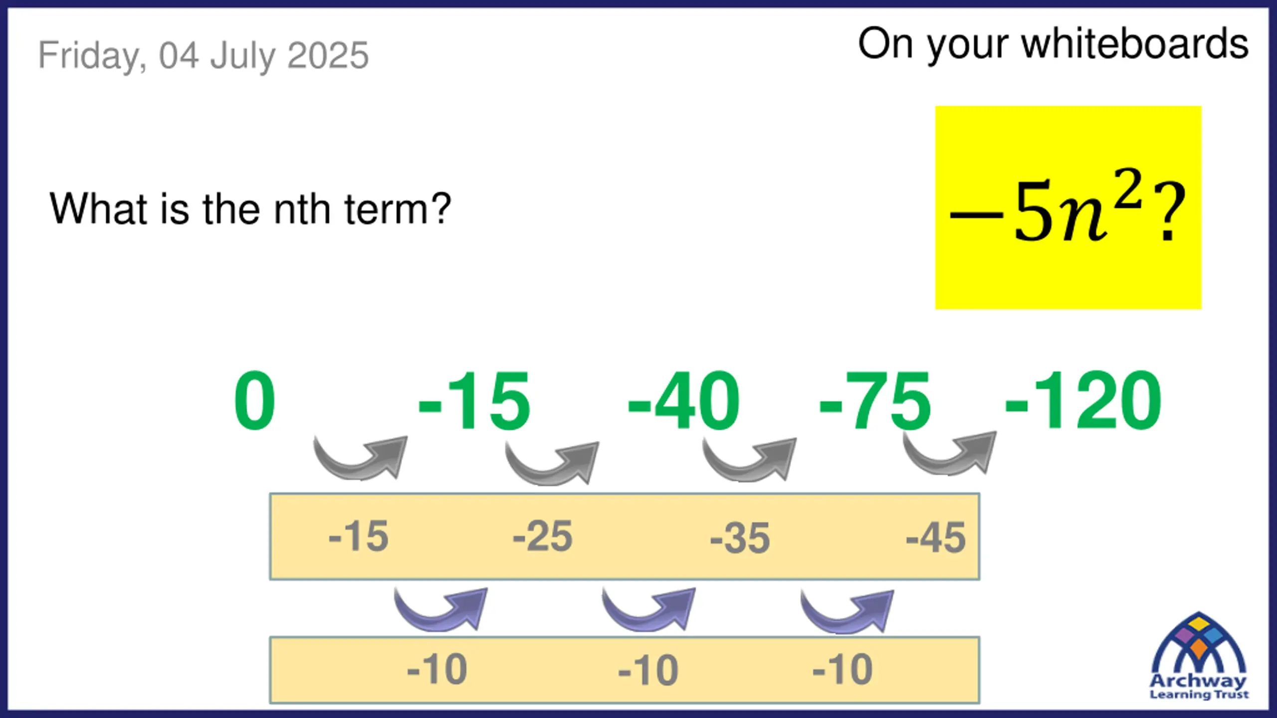 On your whiteboards Friday, 04 July 2025 5?2? What is the nth term? -75 -120 0 -40 -15 -15 -25 -45 -35 -10 -10 -10