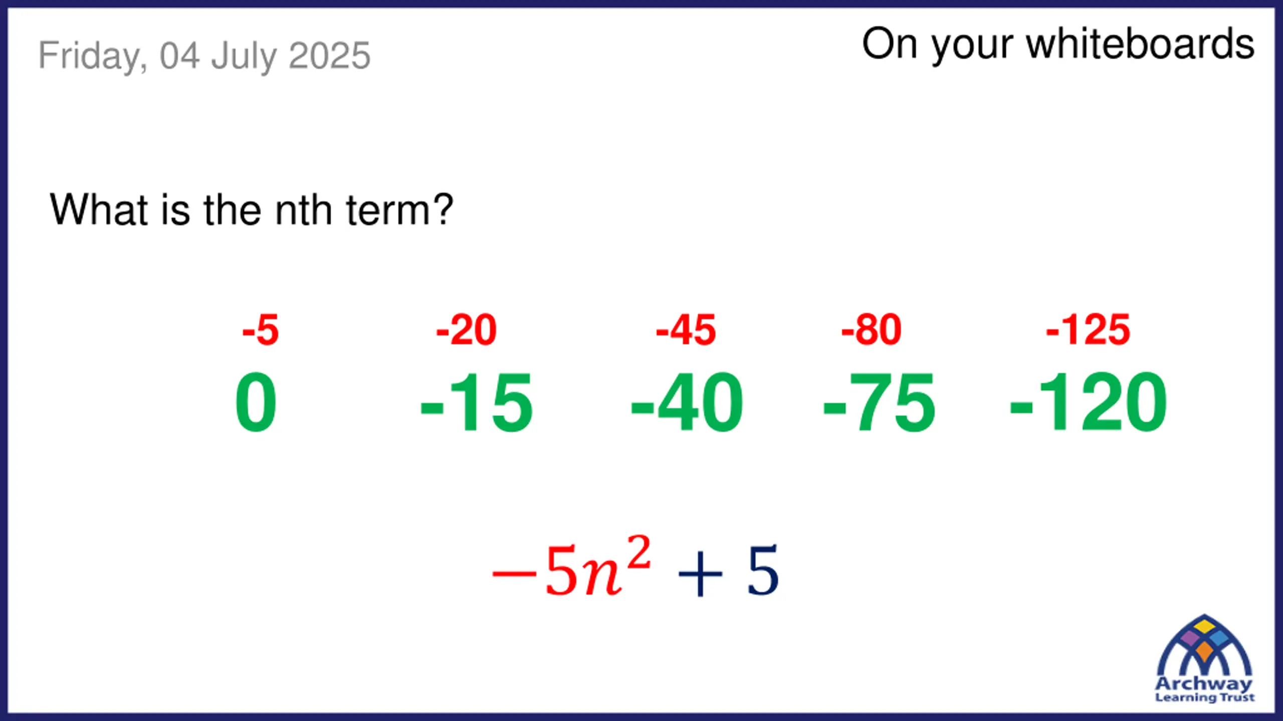 On your whiteboards Friday, 04 July 2025 What is the nth term? -80 -125 -5 -20 -45 -75 -120 0 -40 -15 5?2+ 5