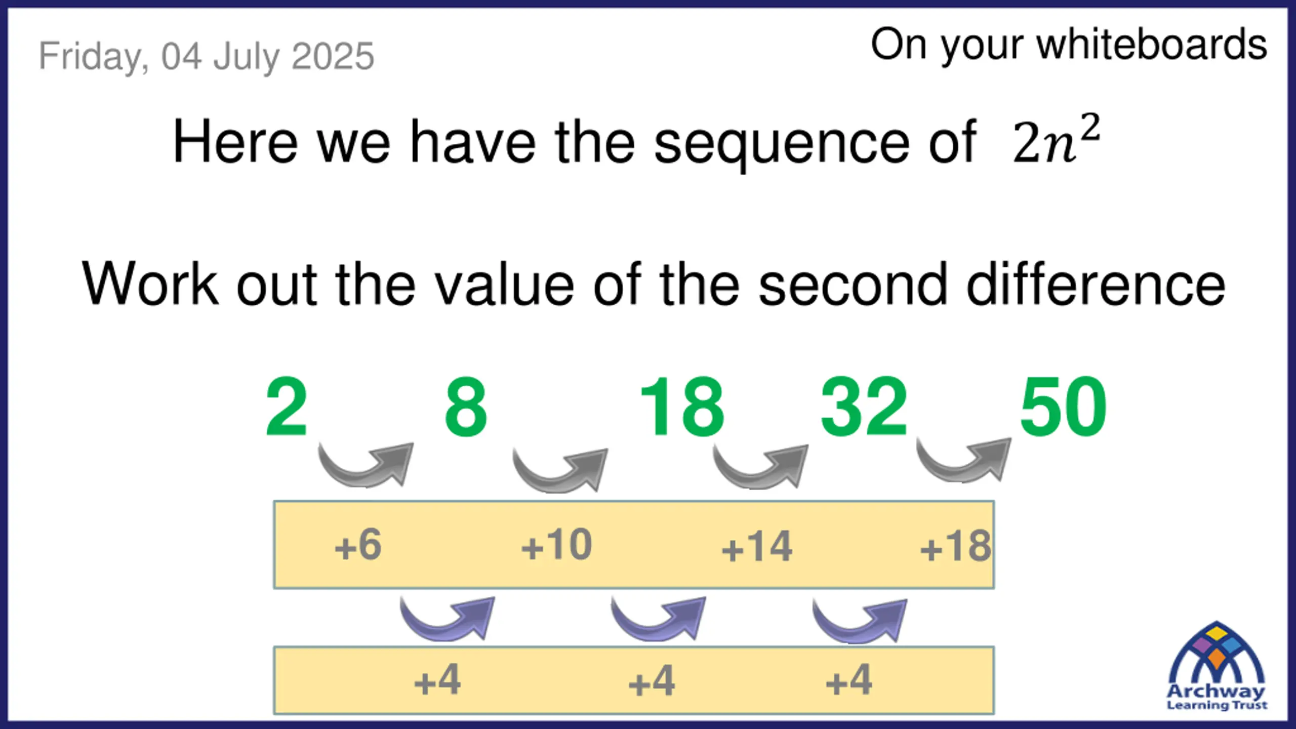 On your whiteboards Friday, 04 July 2025 Here we have the sequence of 2?2 Work out the value of the second difference 32 50 2 18 8 +6 +10 +18 +14 +4 +4 +4