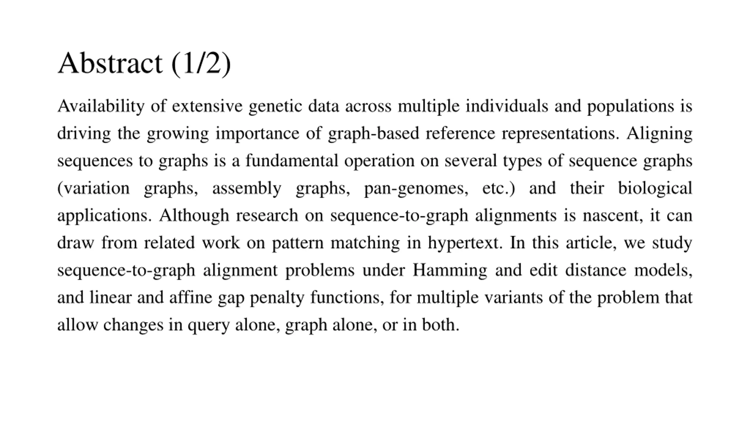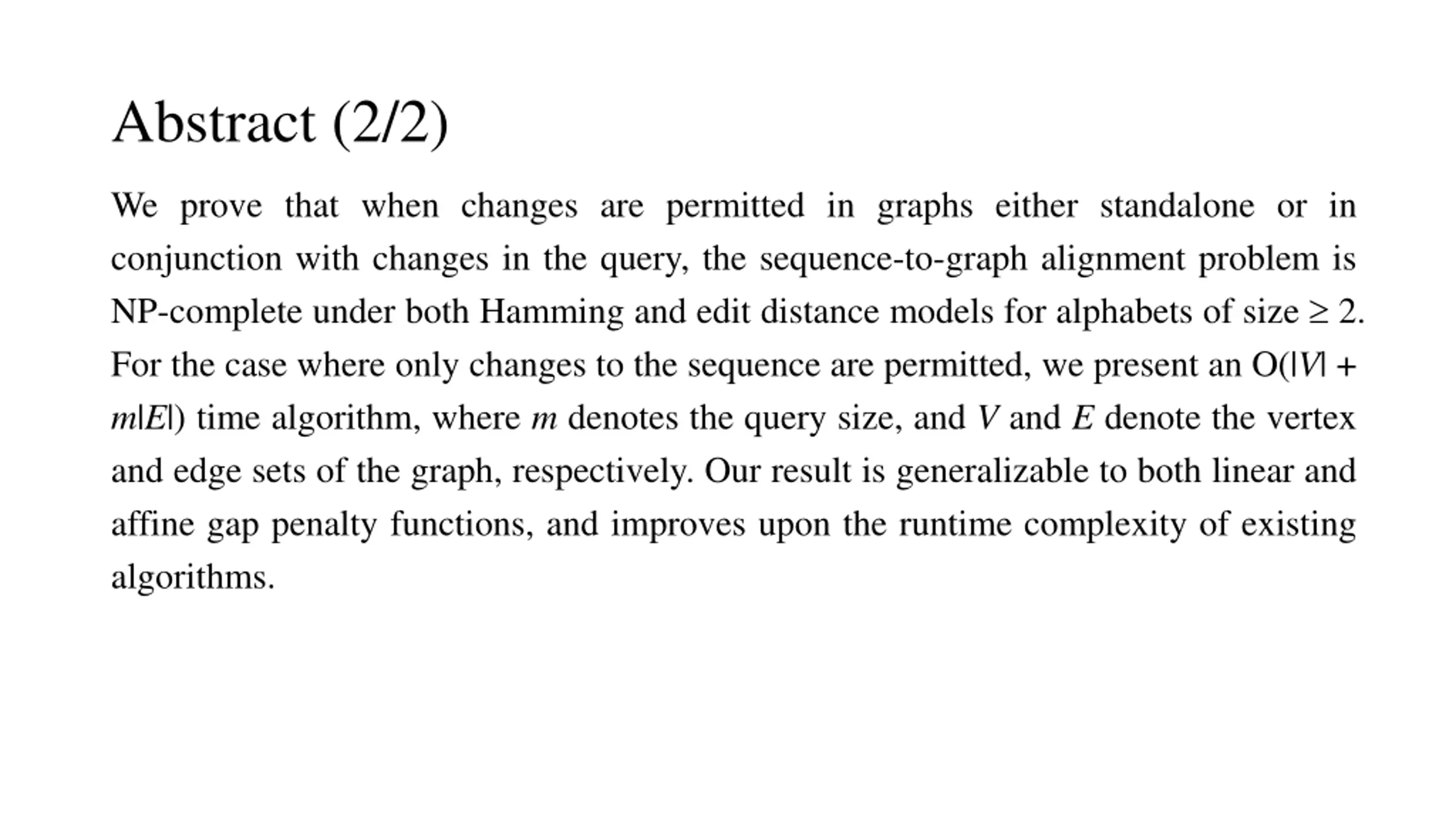 Abstract (2/2) We prove that when changes are permitted in graphs either standalone or in conjunction with changes in the query, the sequence-to-graph alignment problem is NP-complete under both Hamming and edit distance models for alphabets of size 2. For the case where only changes to the sequence are permitted, we present an O(|V| + m|E|) time algorithm, where m denotes the query size, and V and E denote the vertex and edge sets of the graph, respectively. Our result is generalizable to both linear and affine gap penalty functions, and improves upon the runtime complexity of existing algorithms.