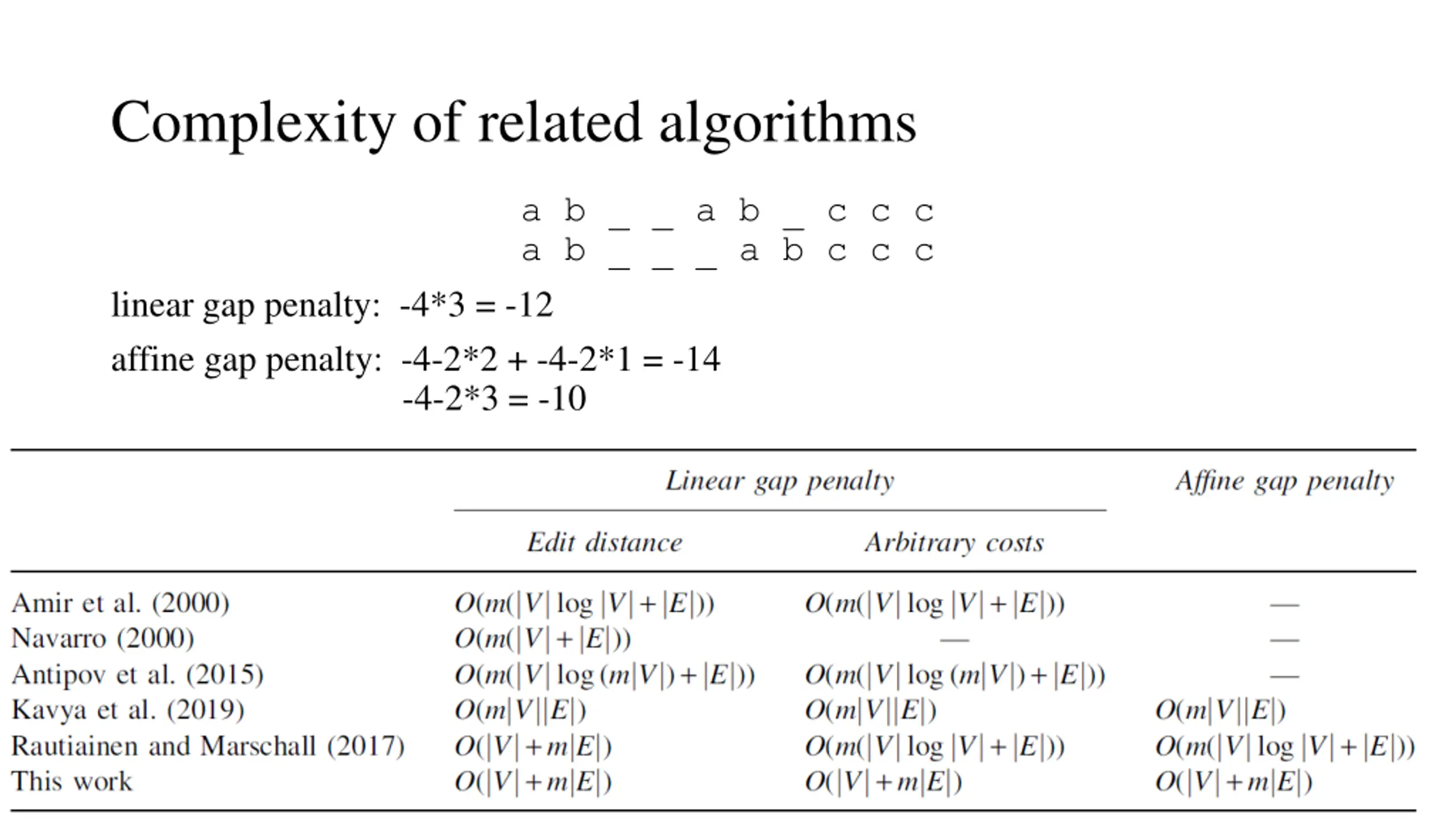 Sequence-to-graph alignment O(|V| + |E|) + O(|V|) O(|V| + |E|) O(|V| + |E|) preprocessing O(m(|V| + |E|)) O(|V| + m|E|)