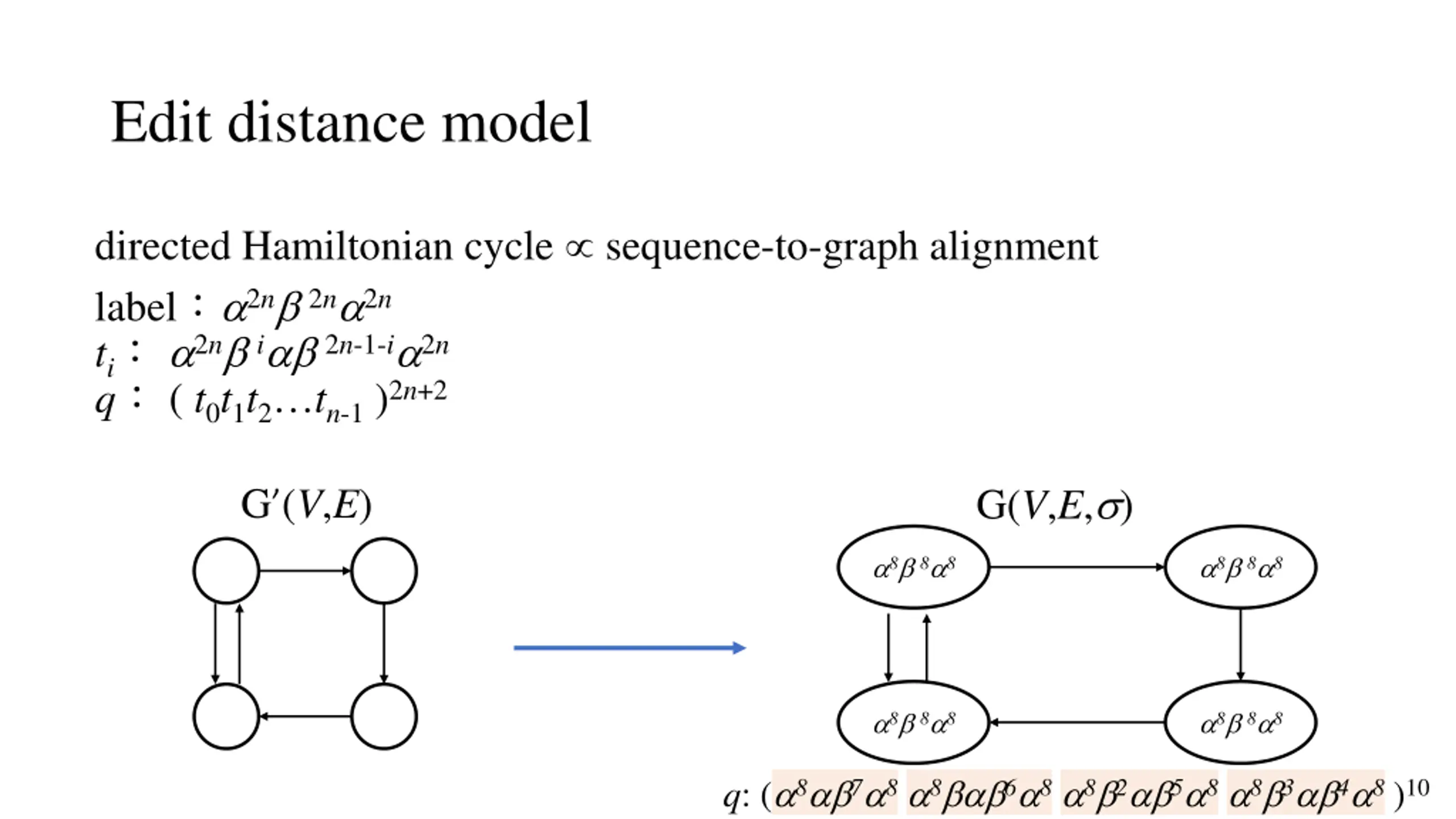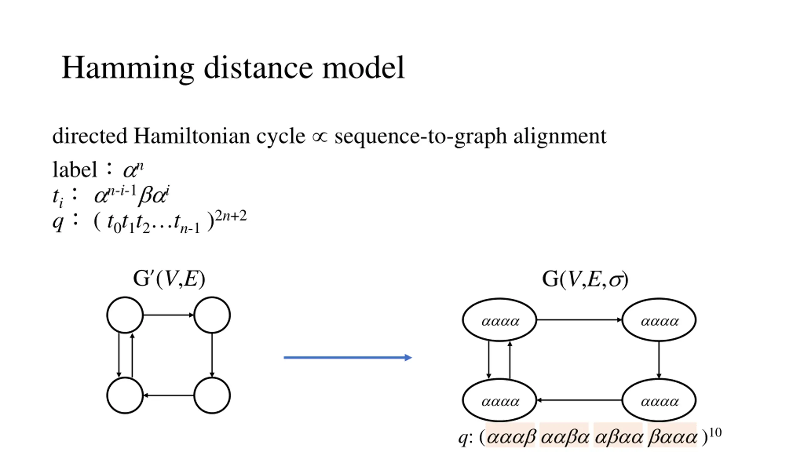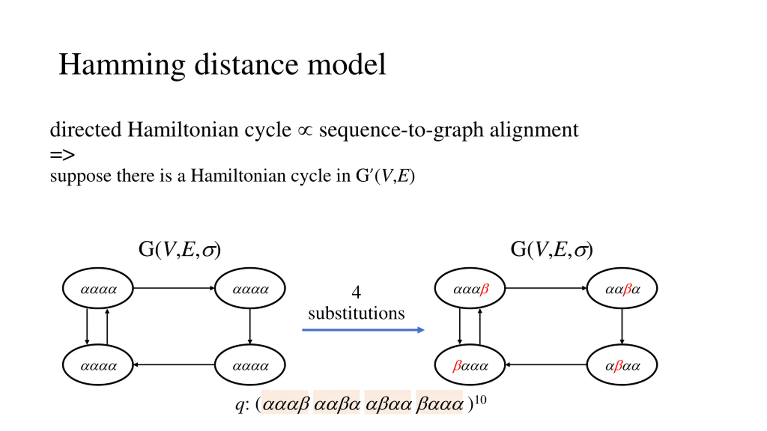 Hamming distance model directed Hamiltonian cycle sequence-to-graph alignment => suppose there is a Hamiltonian cycle in G (V,E) G(V,E, ) G(V,E, ) 4 substitutions q: ( )10