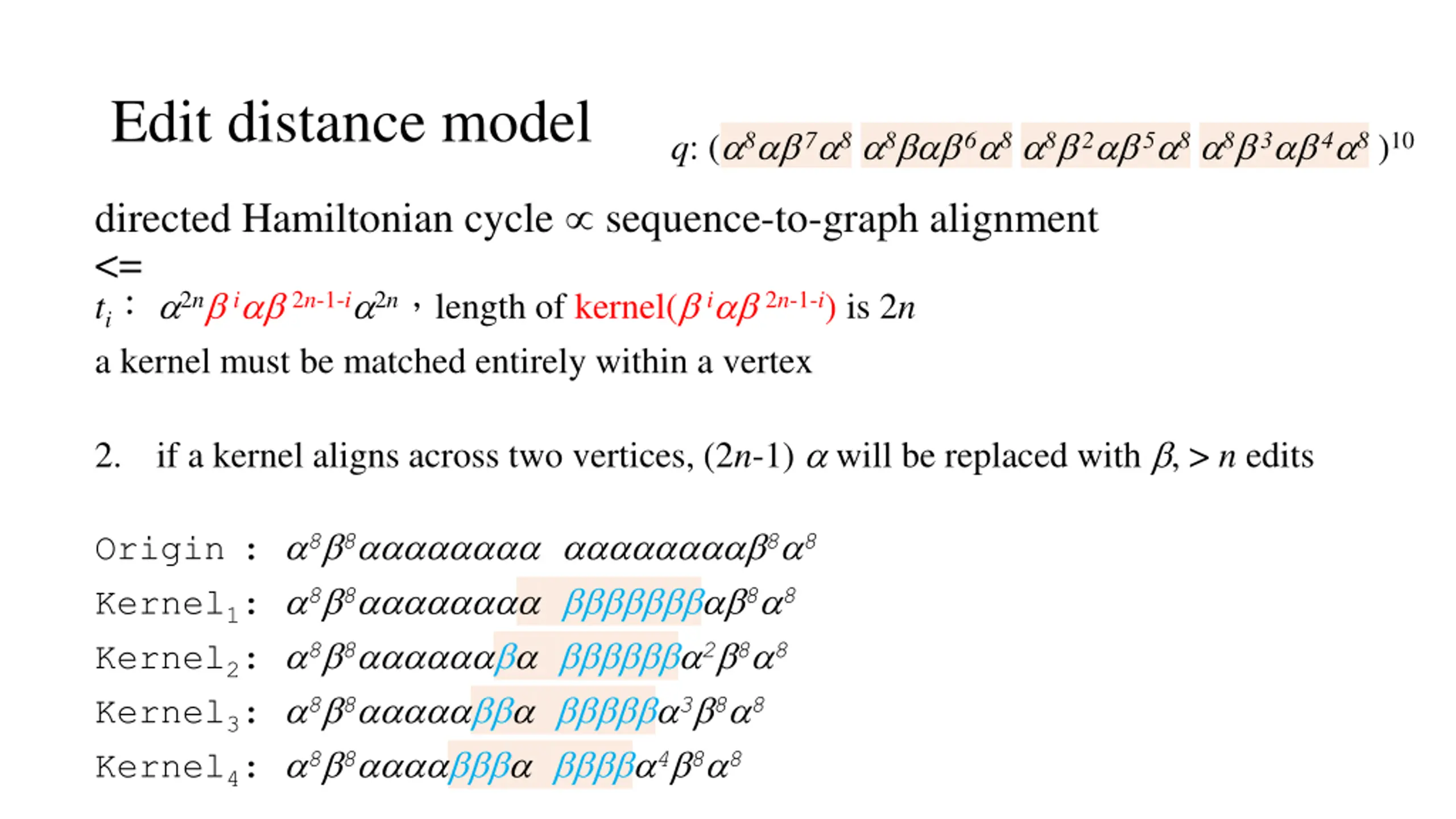 Edit distance model directed Hamiltonian cycle sequence-to-graph alignment <= ti 2n i 2n-1-i 2n length of kernel( i 2n-1-i) is 2n a kernel must be matched entirely within a vertex 1. Since any vertex label cannot shrink from length 6n to < 5n a kernel cannot be matched to an entire vertex after the edits. It implies that a kernel must match to 2 vertices. 6n origin vertex label 5n shrank vertex label 2n kernel