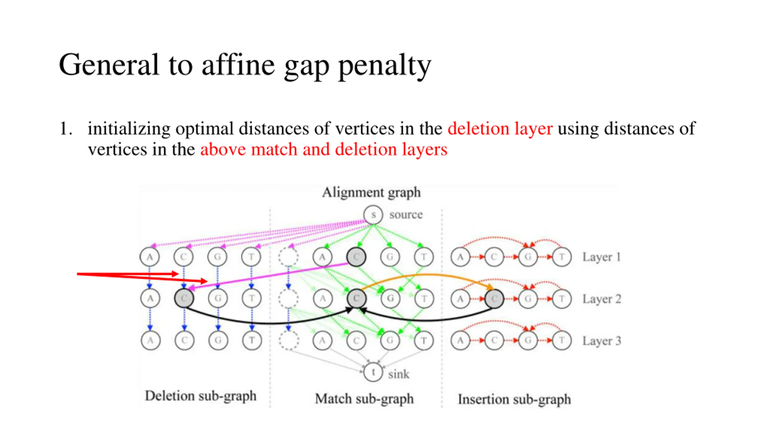 General to affine gap penalty 1. initializing optimal distances of vertices in the deletion layer using distances of vertices in the above match and deletion layers