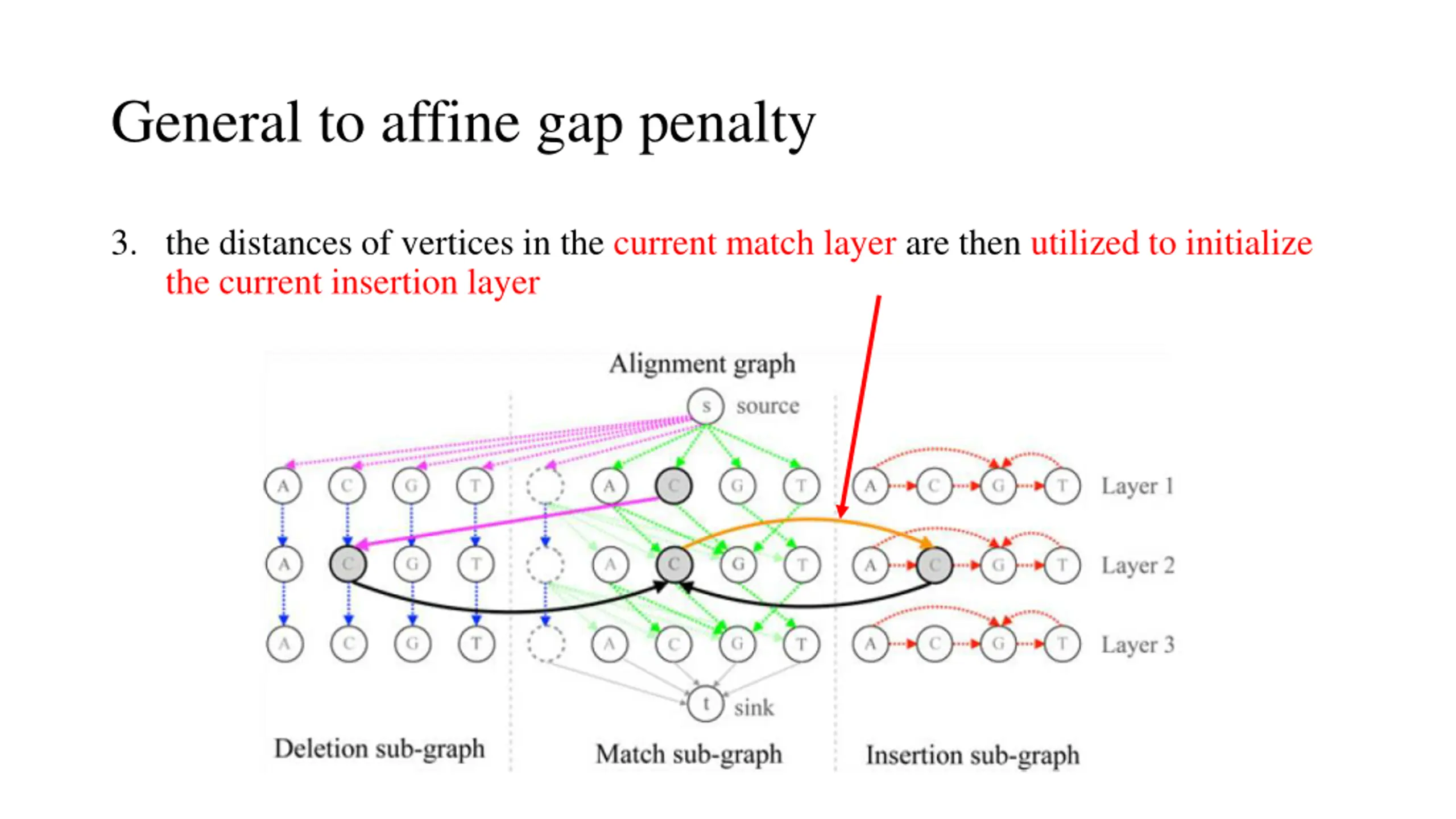 General to affine gap penalty 3. the distances of vertices in the current match layer are then utilized to initialize the current insertion layer