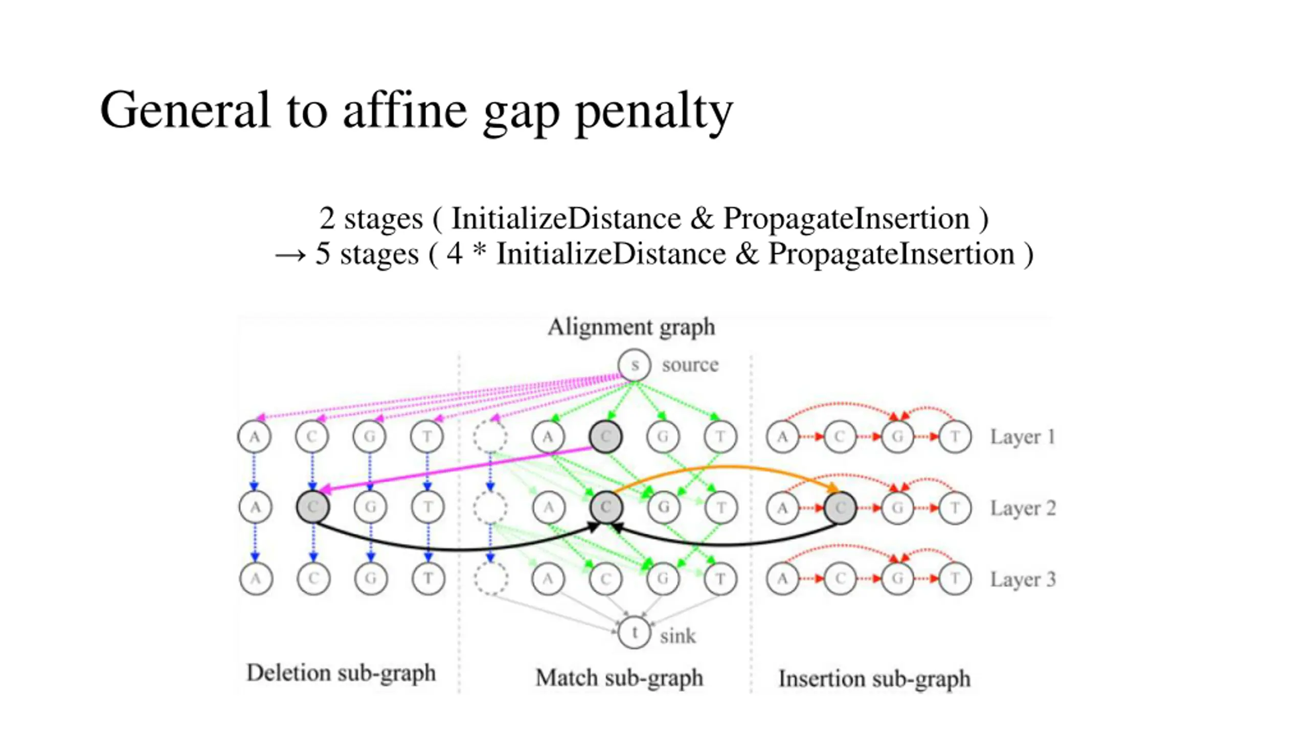 General to affine gap penalty 2 stages ( InitializeDistance & PropagateInsertion ) 5 stages ( 4 * InitializeDistance & PropagateInsertion )