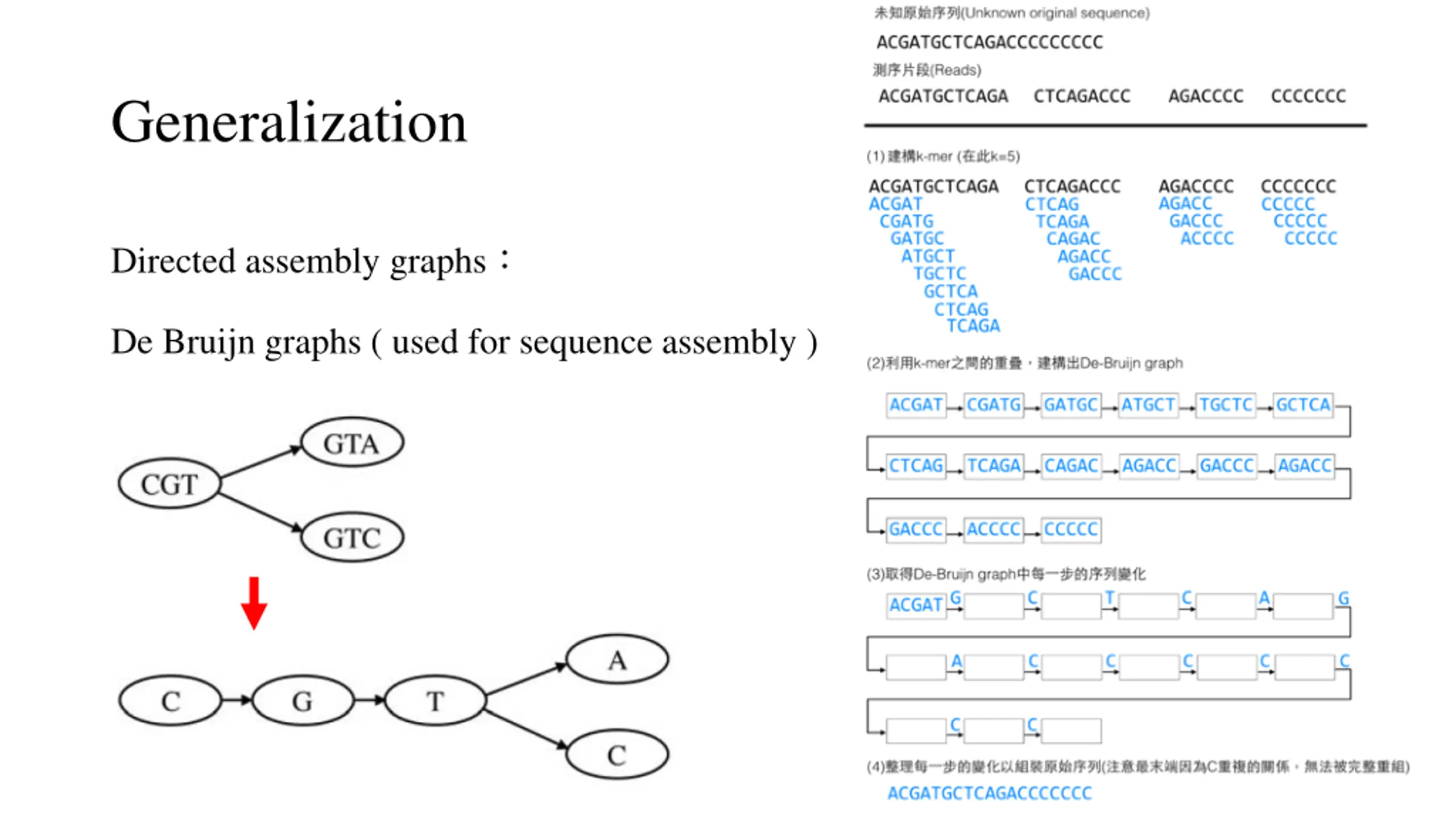 Generalization Directed assembly graphs De Bruijn graphs ( used for sequence assembly )