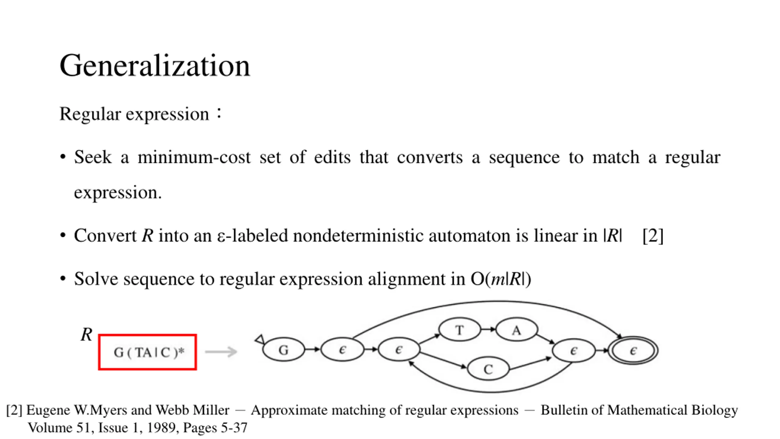 Generalization Regular expression Seek a minimum-cost set of edits that converts a sequence to match a regular expression. Convert R into an -labeled nondeterministic automaton is linear in |R| [2] Solve sequence to regular expression alignment in O(m|R|) R [2] Eugene W.Myers and Webb Miller Approximate matching of regular expressions Bulletin of Mathematical Biology Volume 51, Issue 1, 1989, Pages 5-37
