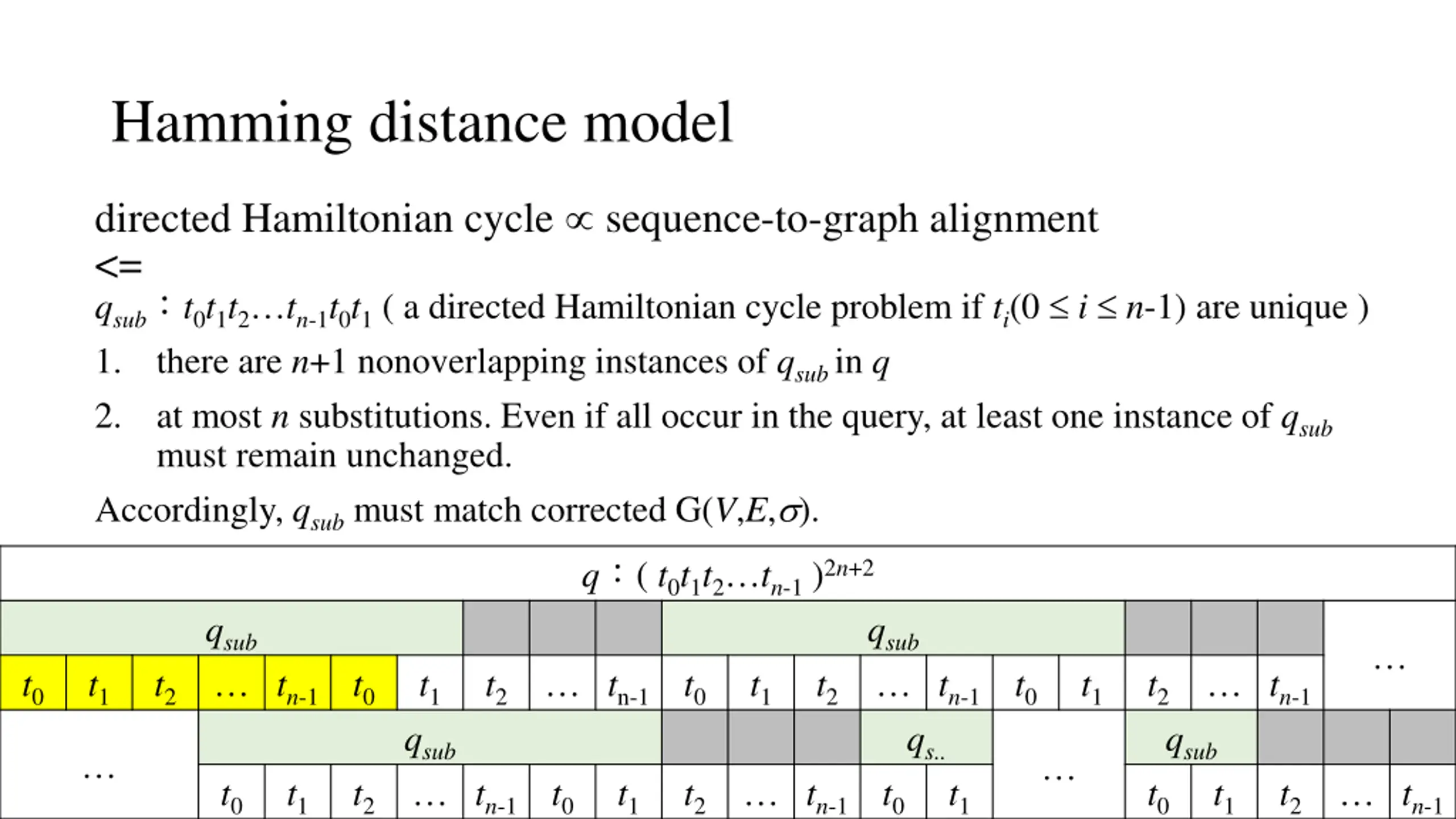 Hamming distance model directed Hamiltonian cycle sequence-to-graph alignment <= qsub t0t1t2 tn-1t0t1( a directed Hamiltonian cycle problem if ti(0 i n-1) are unique ) 1. there are n+1 nonoverlapping instances of qsubin q 2. at most n substitutions. Even if all occur in the query, at least one instance of qsub must remain unchanged. Accordingly, qsubmust match corrected G(V,E, ). q ( t0t1t2 tn-1)2n+2 qsub t1 t2 tn-1 t0 t1 t2 tn-1 t0 qsub t0 t1 t2 tn-1 t0 t1 t2 qsub tn-1 qs.. t0 t0 t1 t2 t0 t1 t2 tn-1 qsub t0 t1 tn-1 t1 t2 tn-1