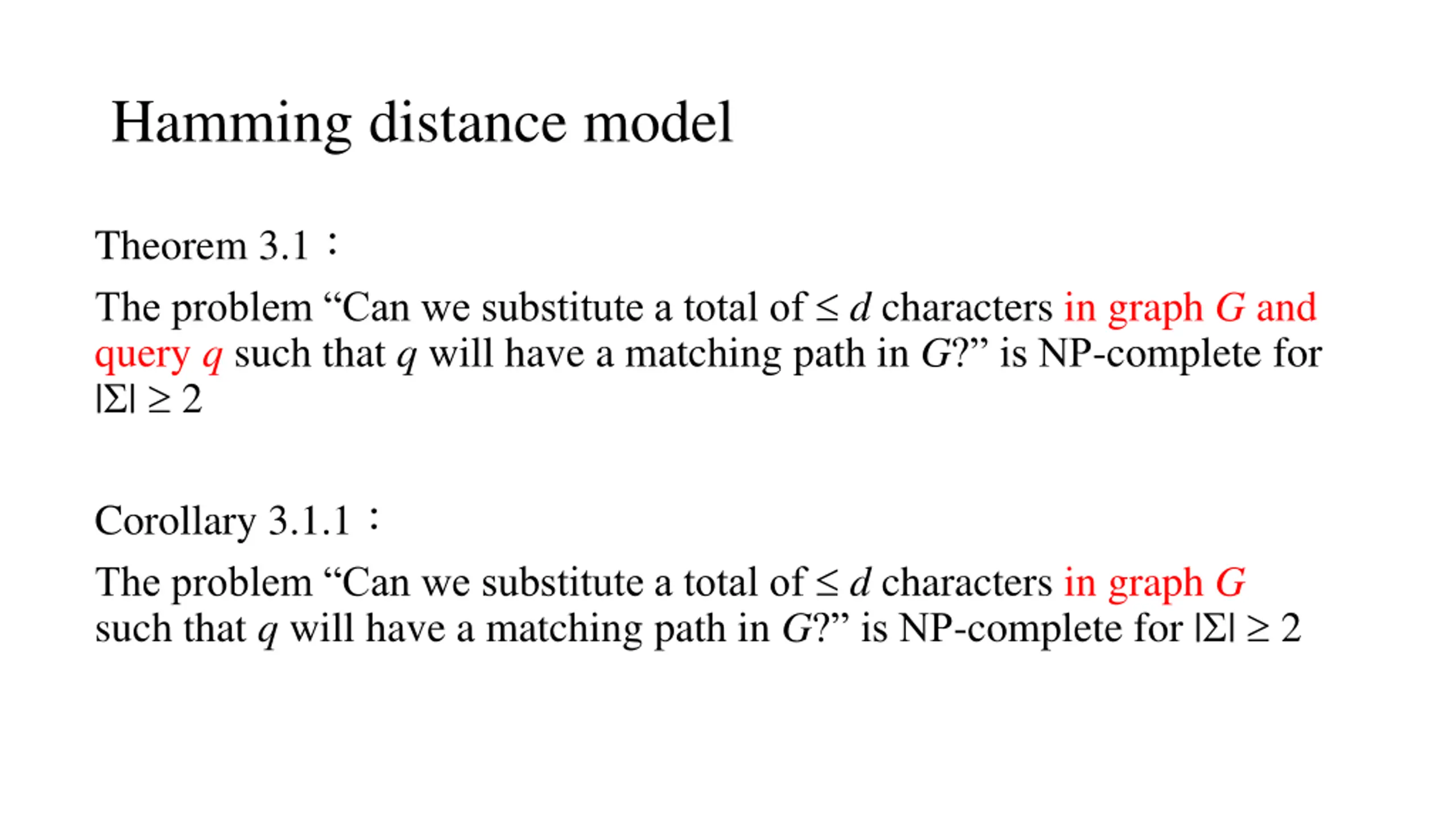 Hamming distance model Theorem 3.1 The problem Can we substitute a total of d characters in graph G and query q such that q will have a matching path in G? is NP-complete for | | 2 Corollary 3.1.1 The problem Can we substitute a total of d characters in graph G such that q will have a matching path in G? is NP-complete for | | 2