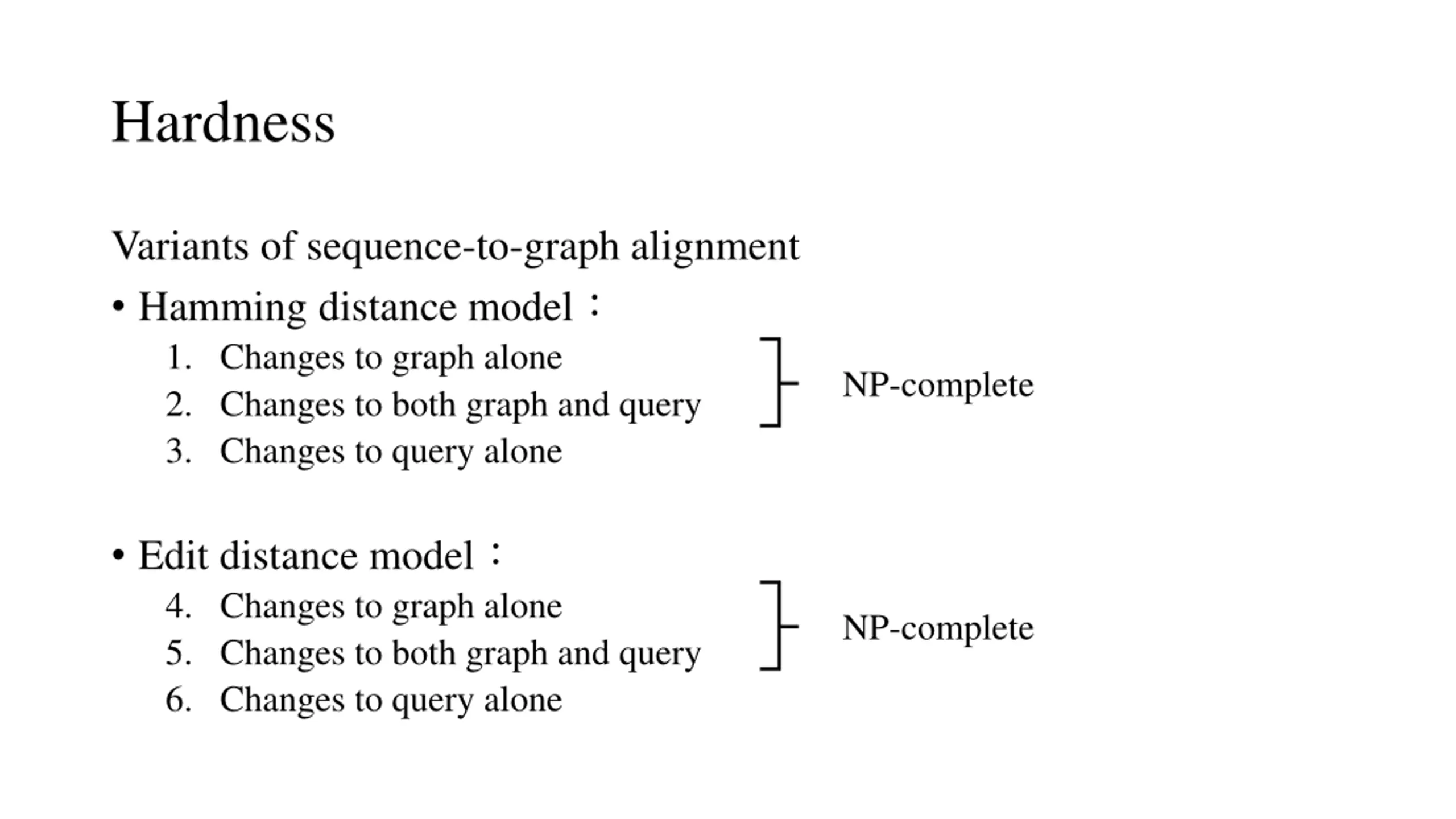 Hardness Variants of sequence-to-graph alignment Hamming distance model 1. Changes to graph alone 2. Changes to both graph and query 3. Changes to query alone NP-complete Edit distance model 4. Changes to graph alone 5. Changes to both graph and query 6. Changes to query alone NP-complete