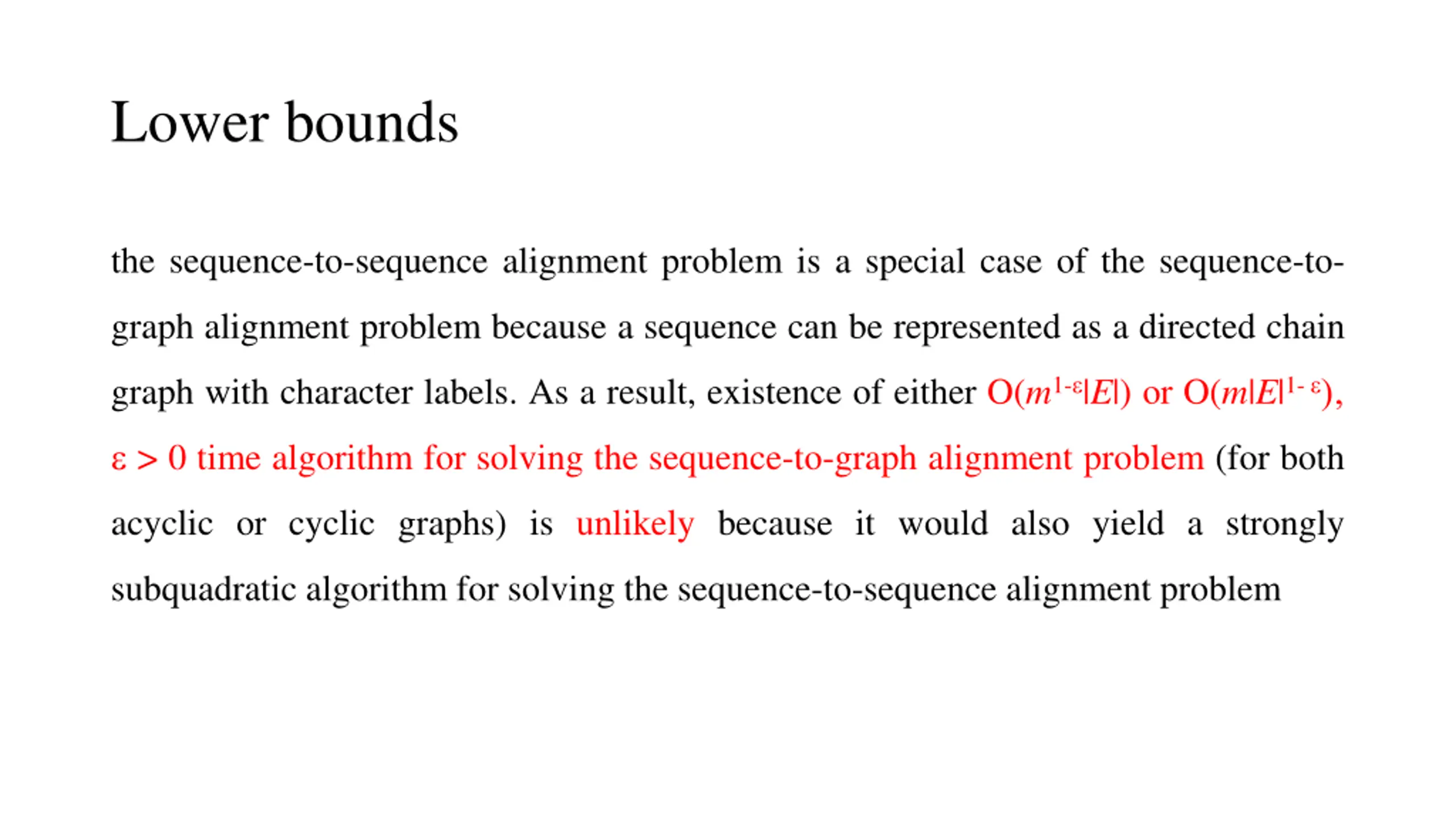 Lower bounds the sequence-to-sequence alignment problem is a special case of the sequence-to- graph alignment problem because a sequence can be represented as a directed chain graph with character labels. As a result, existence of either O(m1- |E|) or O(m|E|1- ) > 0 time algorithm for solving the sequence-to-graph alignment problem (for both acyclic or cyclic graphs) is unlikely because it would also yield a strongly subquadratic algorithm for solving the sequence-to-sequence alignment problem
