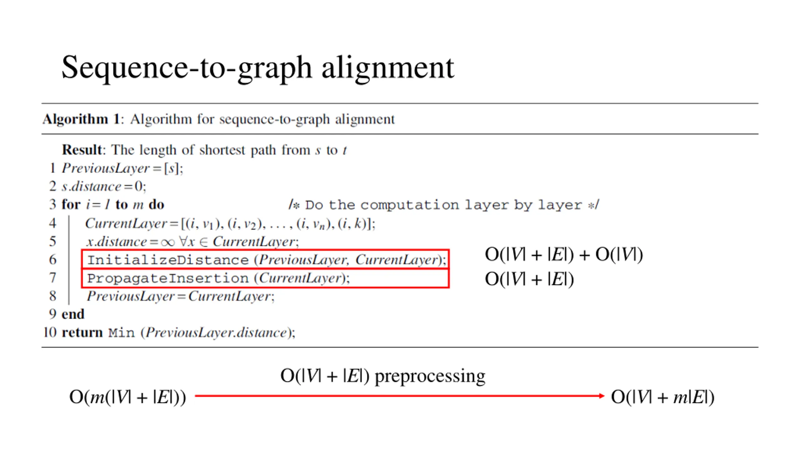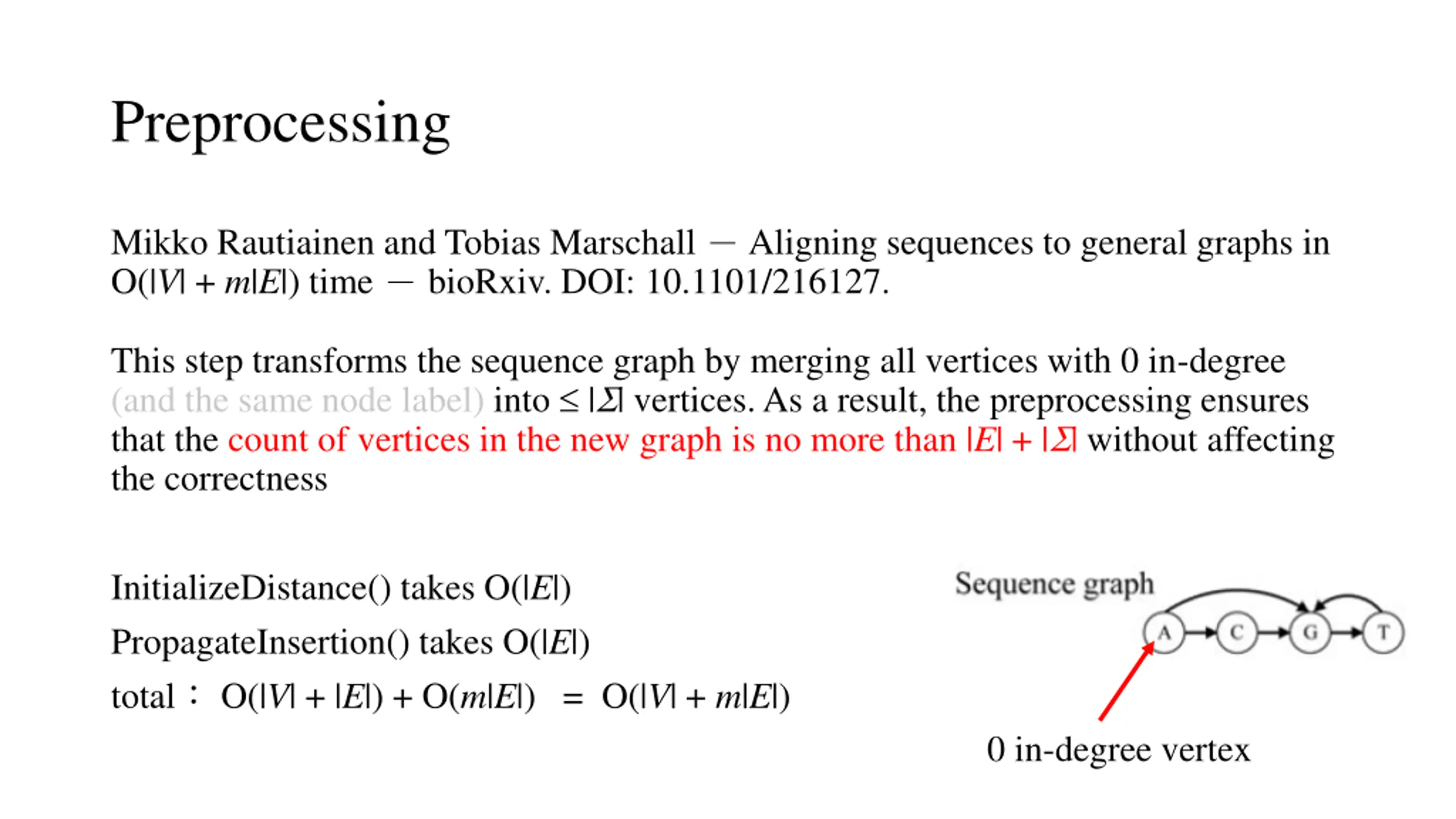 Preprocessing Mikko Rautiainen and Tobias Marschall Aligning sequences to general graphs in O(|V| + m|E|) time bioRxiv. DOI: 10.1101/216127. This step transforms the sequence graph by merging all vertices with 0 in-degree (and the same node label) into | | vertices. As a result, the preprocessing ensures that the count of vertices in the new graph is no more than |E| + | | without affecting the correctness InitializeDistance() takes O(|E|) PropagateInsertion() takes O(|E|) total O(|V| + |E|) + O(m|E|) = O(|V| + m|E|) 0 in-degree vertex