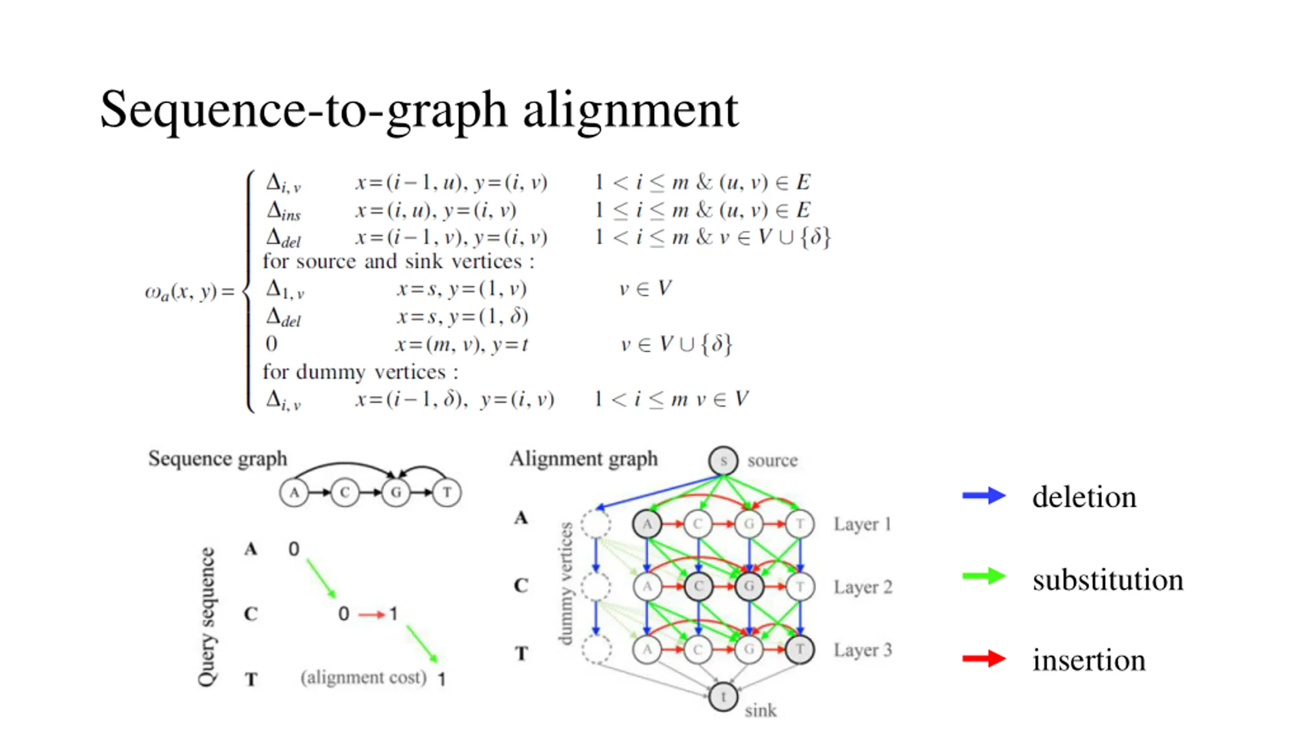 Sequence-to-graph alignment A 1 0 1 2 C 2 1 0 1 G 3 2 1 1 T 4 3 2 1 0 1 2 3 1. sequence-to-sequence alignment DP shortest-path problem A C T 2. sequence-to-graph alignment DP only for DAG (Directed Acyclic Graph) shortest-path problem polynomially solvable when changes are allowed in the query sequence alone