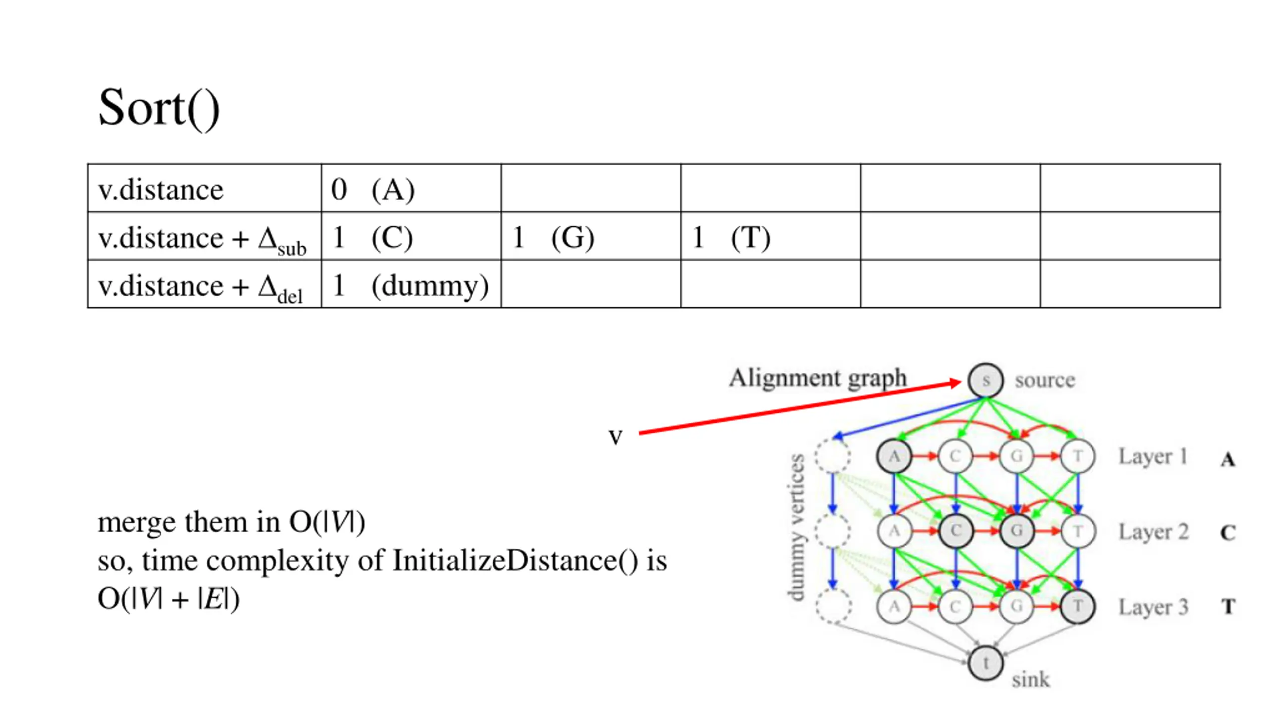 Sort() v.distance v.distance + sub 1 (C) v.distance + del 0 (A) 1 (G) 1 (T) 1 (dummy) v merge them in O(|V|) so, time complexity of InitializeDistance() is O(|V| + |E|)