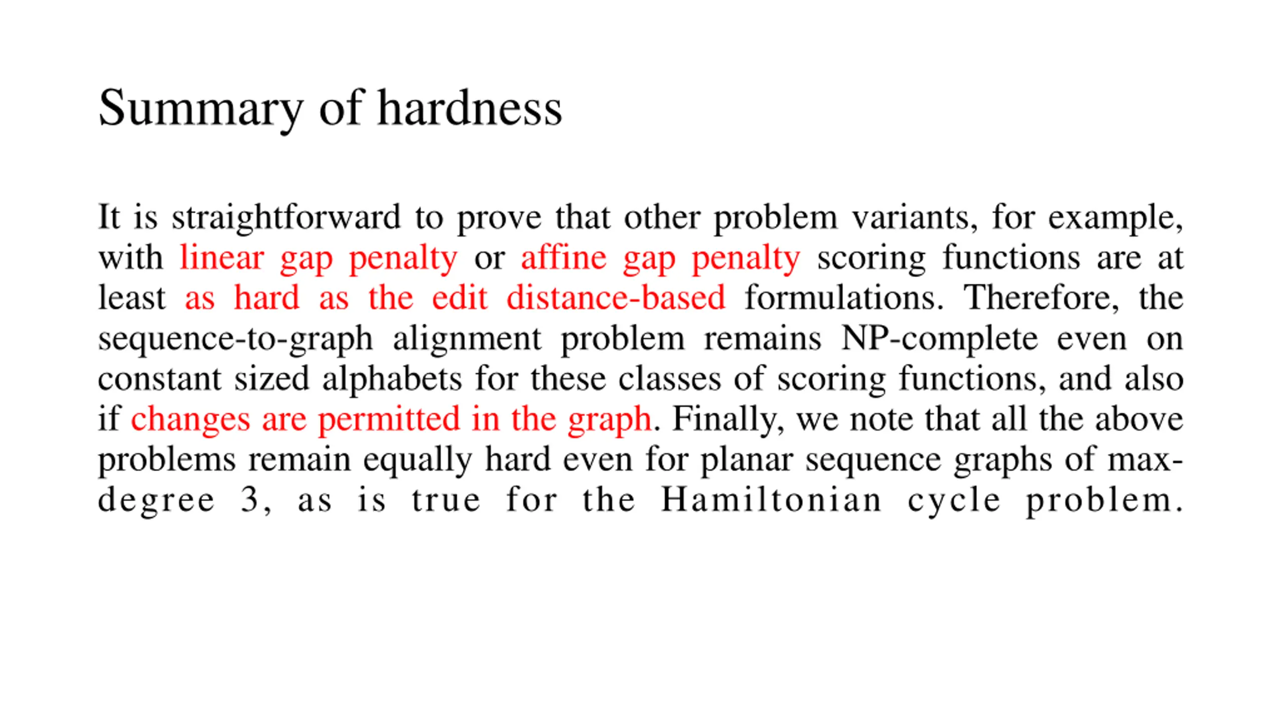 Summary of hardness It is straightforward to prove that other problem variants, for example, with linear gap penalty or affine gap penalty scoring functions are at least as hard as the edit distance-based formulations. Therefore, the sequence-to-graph alignment problem remains NP-complete even on constant sized alphabets for these classes of scoring functions, and also if changes are permitted in the graph. Finally, we note that all the above problems remain equally hard even for planar sequence graphs of max- degree 3, as is true for the Hamiltonian cycle problem.