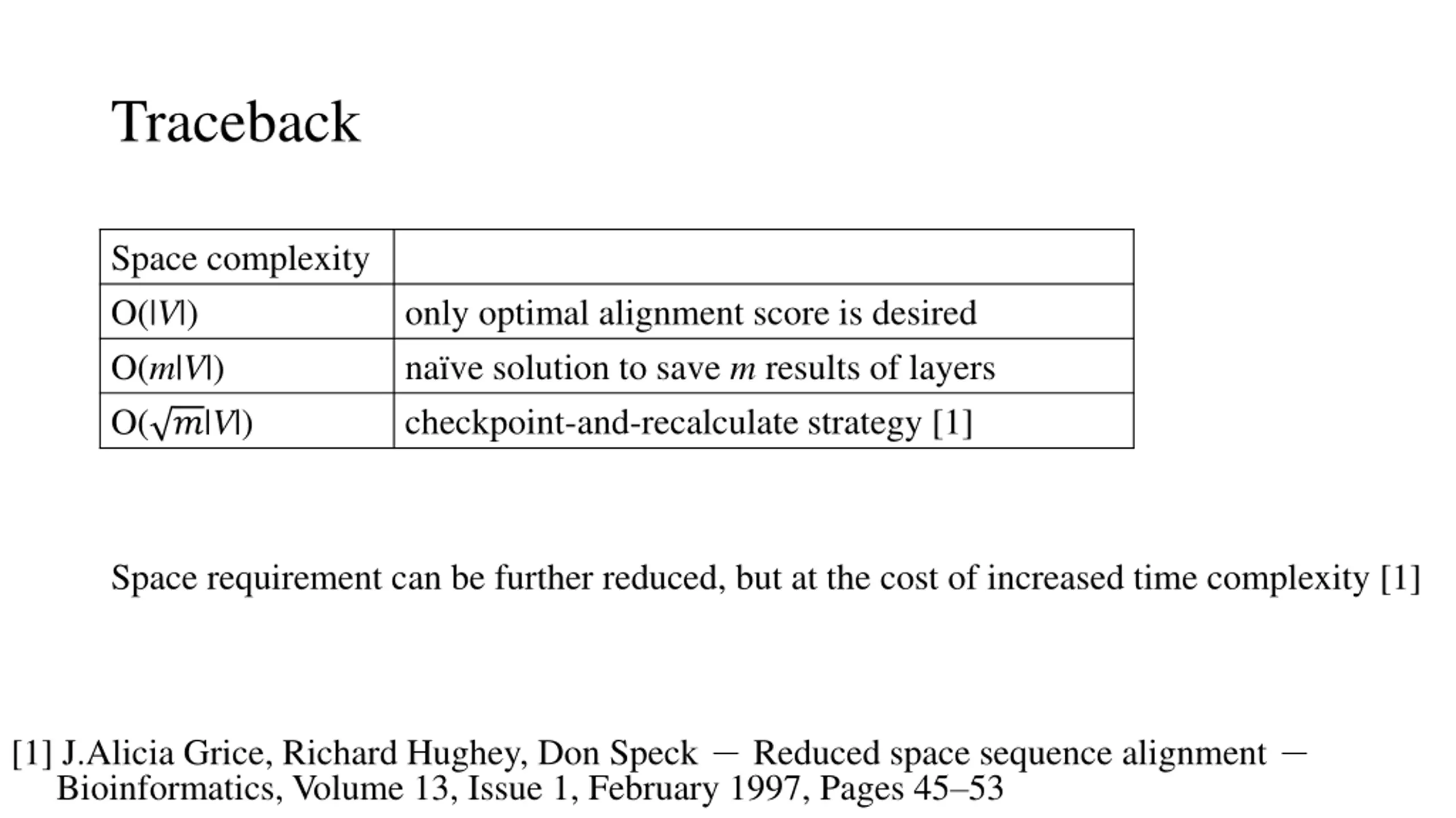 Traceback Space complexity O(|V|) O(m|V|) O( ?|V|) only optimal alignment score is desired na ve solution to save m results of layers checkpoint-and-recalculate strategy [1] Space requirement can be further reduced, but at the cost of increased time complexity [1] [1] J.Alicia Grice, Richard Hughey, Don Speck Reduced space sequence alignment Bioinformatics, Volume 13, Issue 1, February 1997, Pages 45 53