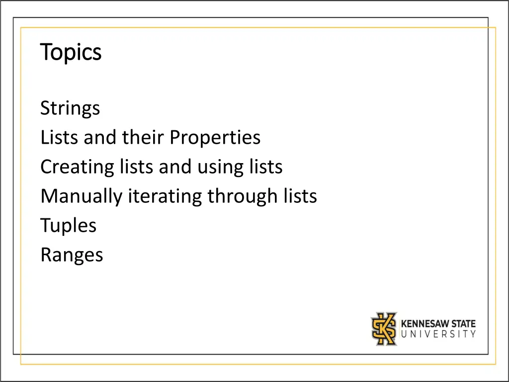Topics Topics Strings Lists and their Properties Creating lists and using lists Manually iterating through lists Tuples Ranges
