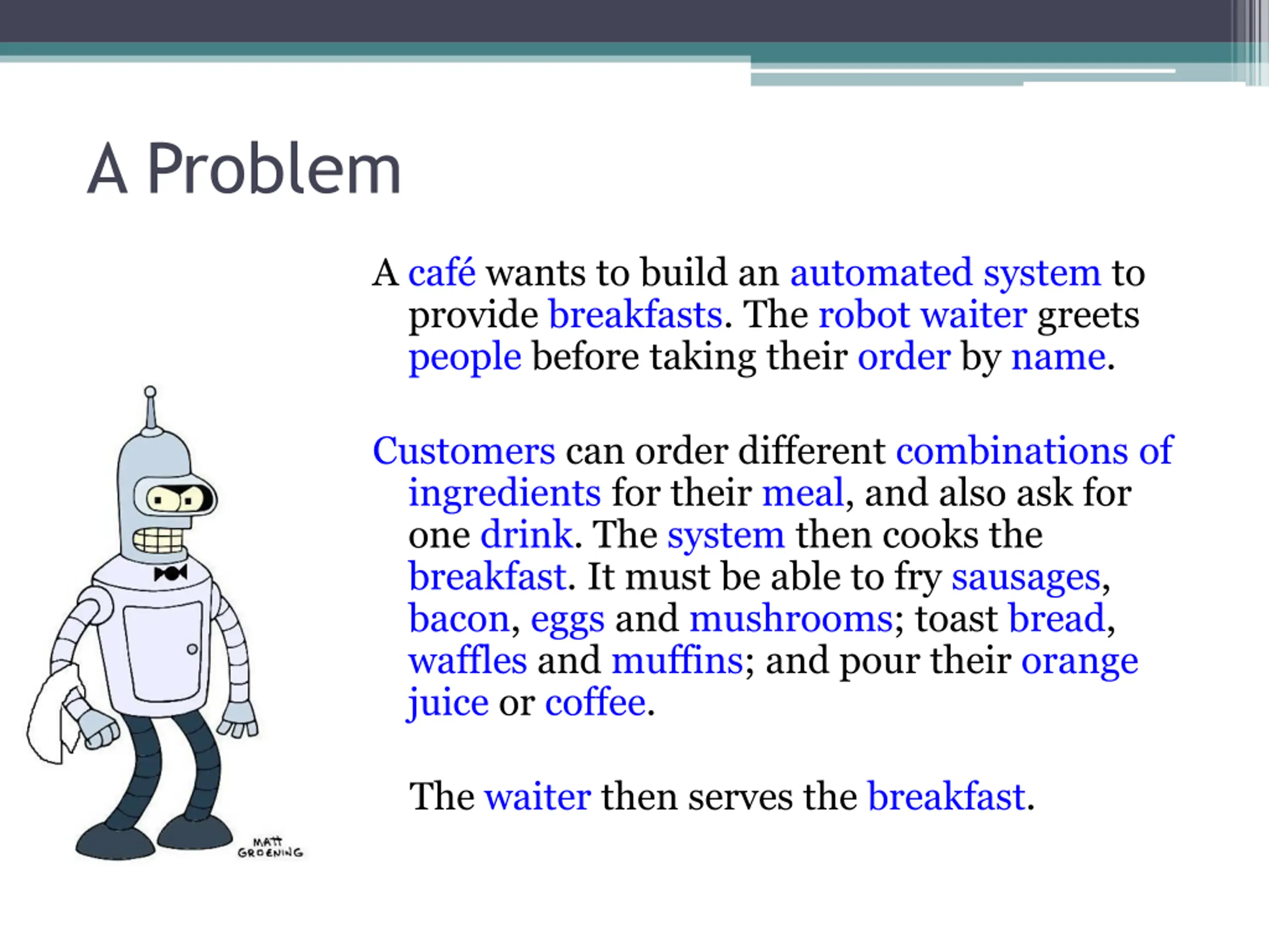 A Problem A caf wants to build an automated system to provide breakfasts. The robot waiter greets people before taking their order by name. Customers can order different combinations of ingredients for their meal, and also ask for one drink. The system then cooks the breakfast. It must be able to fry sausages, bacon, eggs and mushrooms; toast bread, waffles and muffins; and pour their orange juice or coffee. The waiter then serves the breakfast.