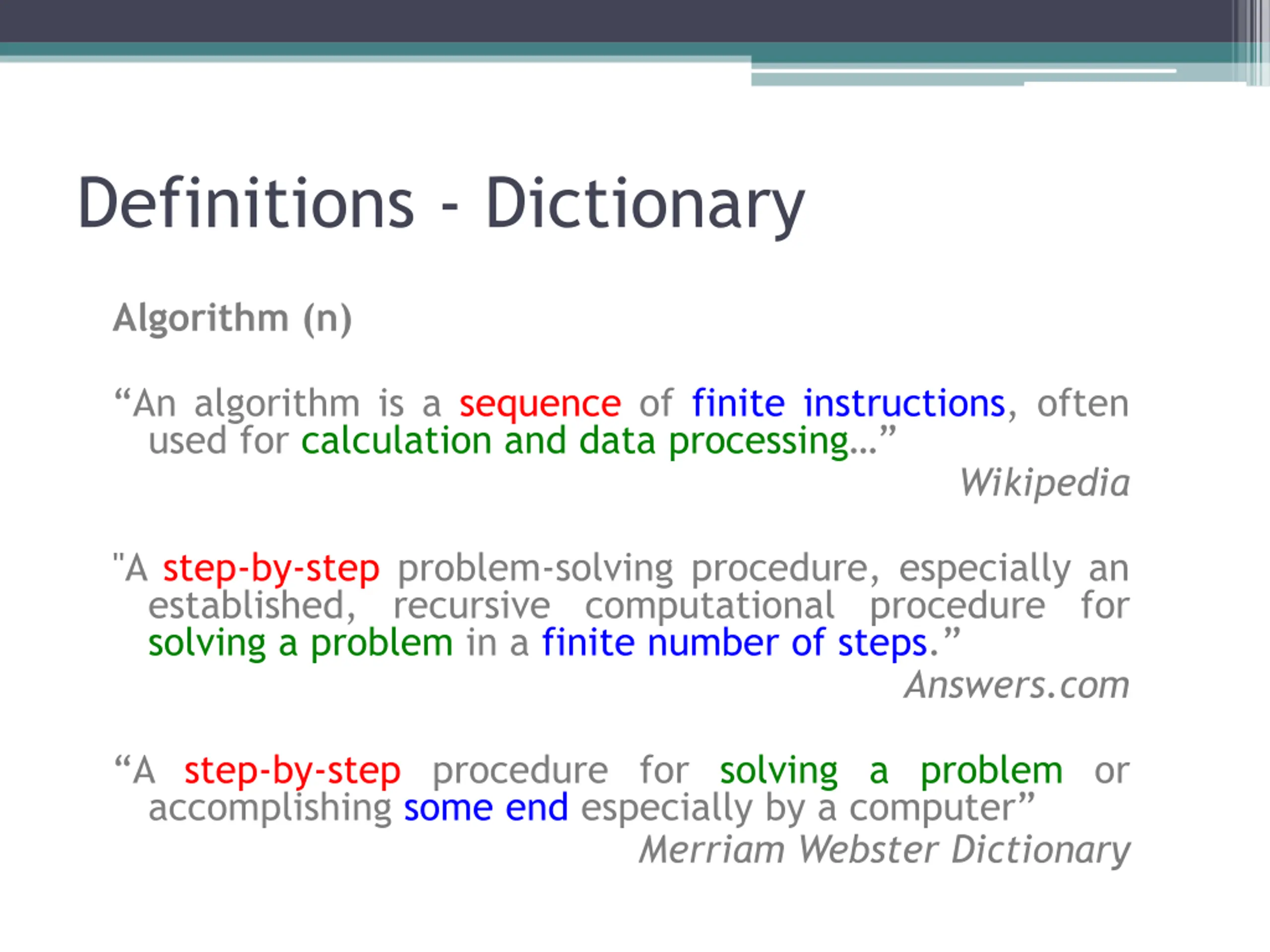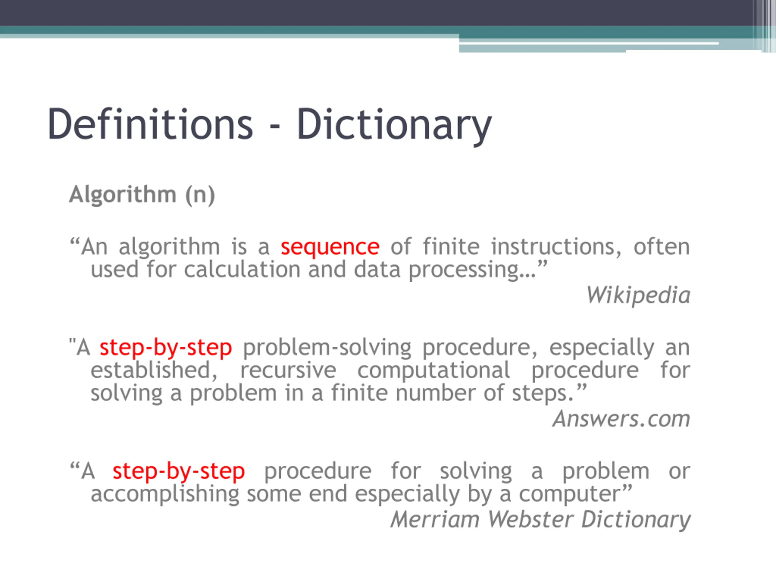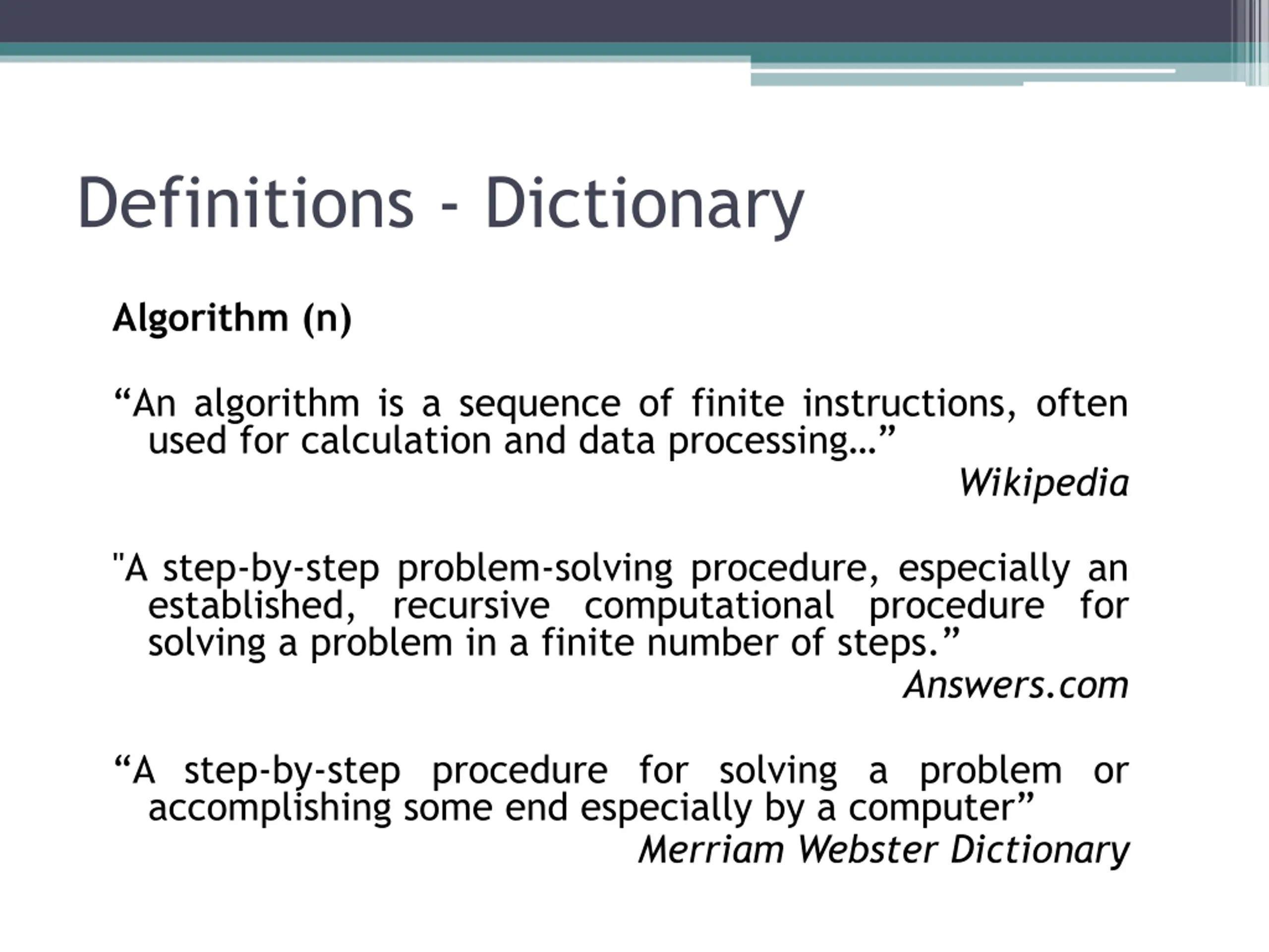 Definitions - Dictionary Algorithm (n) An algorithm is a sequence of finite instructions, often used for calculation and data processing Wikipedia "A step-by-step problem-solving procedure, especially an established, recursive computational procedure for solving a problem in a finite number of steps. Answers.com A step-by-step procedure for solving a problem or accomplishing some end especially by a computer Merriam Webster Dictionary