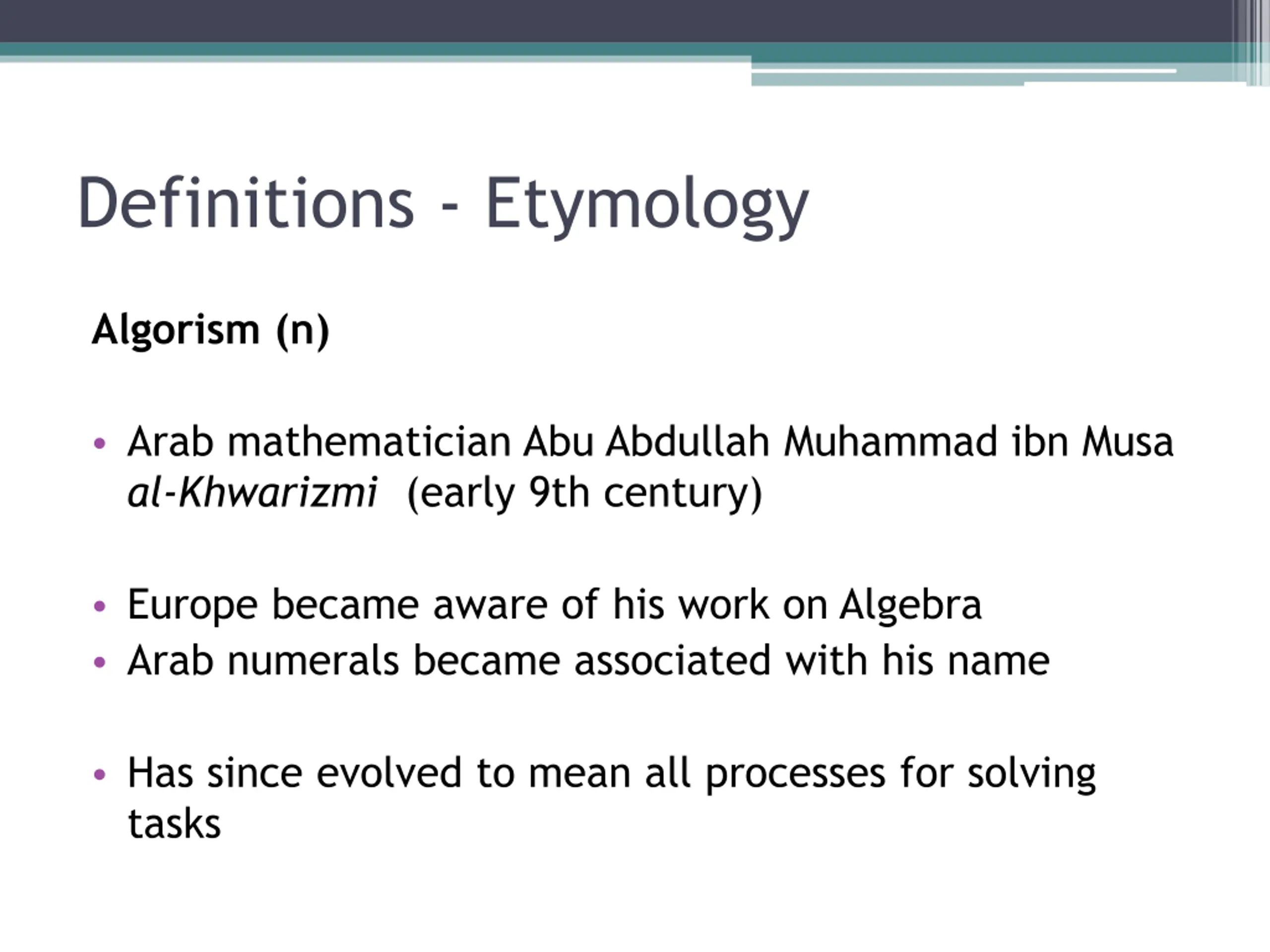 Definitions - Etymology Algorism (n) Arab mathematician Abu Abdullah Muhammad ibn Musa al-Khwarizmi (early 9th century) Europe became aware of his work on Algebra Arab numerals became associated with his name Has since evolved to mean all processes for solving tasks