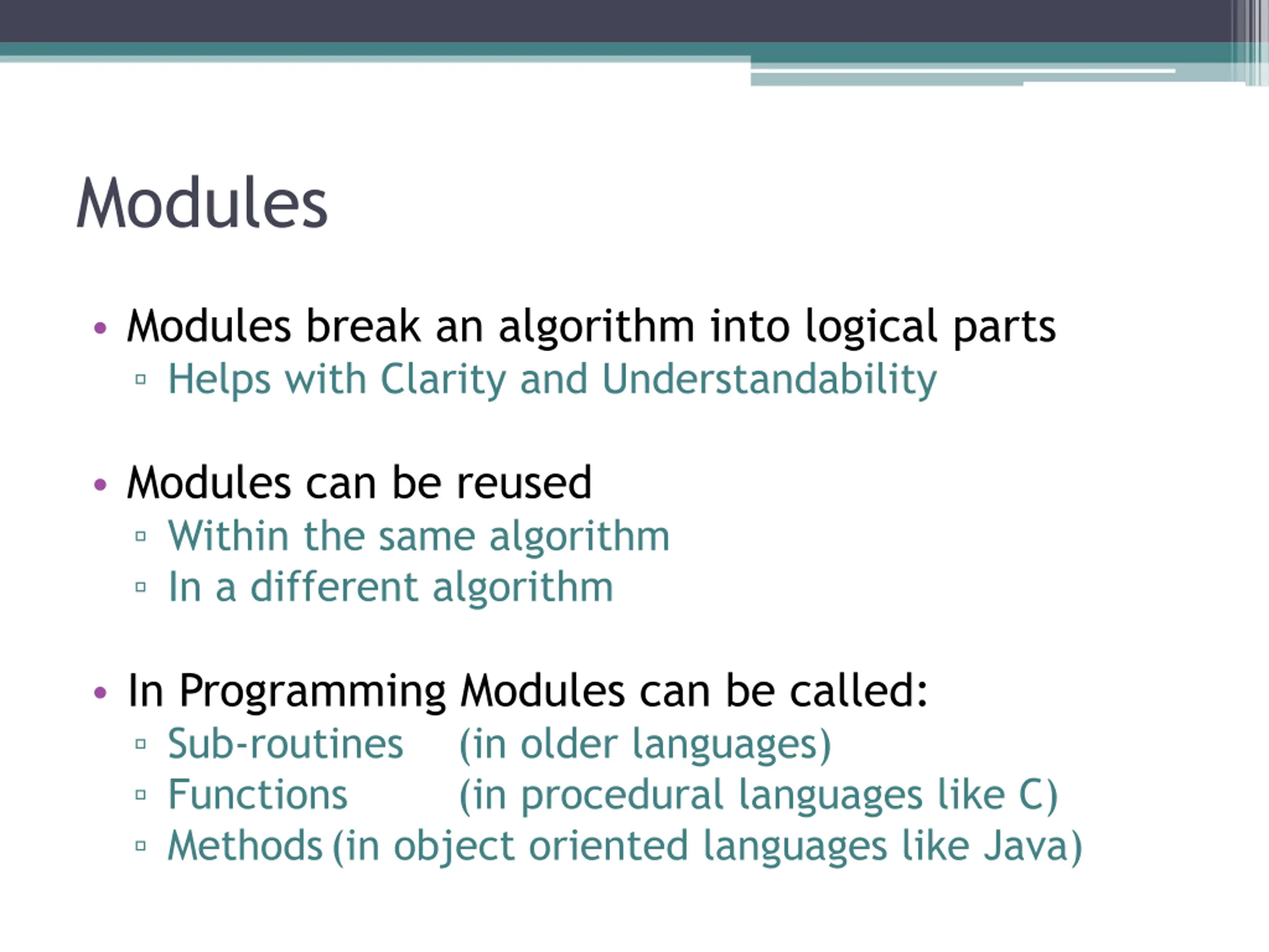 Modules Modules break an algorithm into logical parts Helps with Clarity and Understandability Modules can be reused Within the same algorithm In a different algorithm In Programming Modules can be called: Sub-routines (in older languages) Functions (in procedural languages like C) Methods (in object oriented languages like Java)
