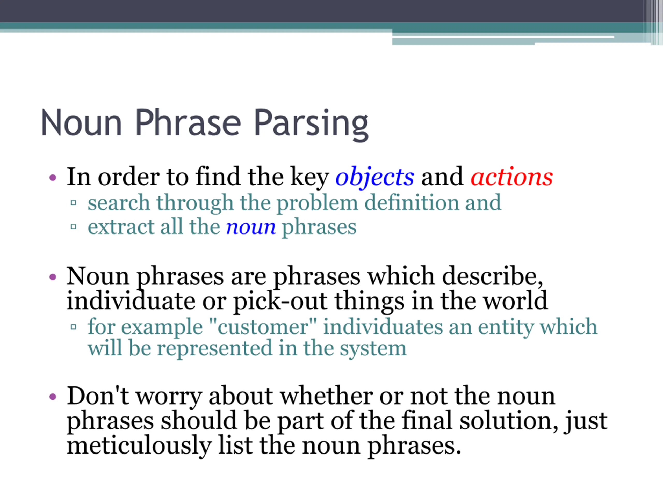 Noun Phrase Parsing In order to find the key objects and actions search through the problem definition and extract all the noun phrases Noun phrases are phrases which describe, individuate or pick-out things in the world for example "customer" individuates an entity which will be represented in the system Don't worry about whether or not the noun phrases should be part of the final solution, just meticulously list the noun phrases.