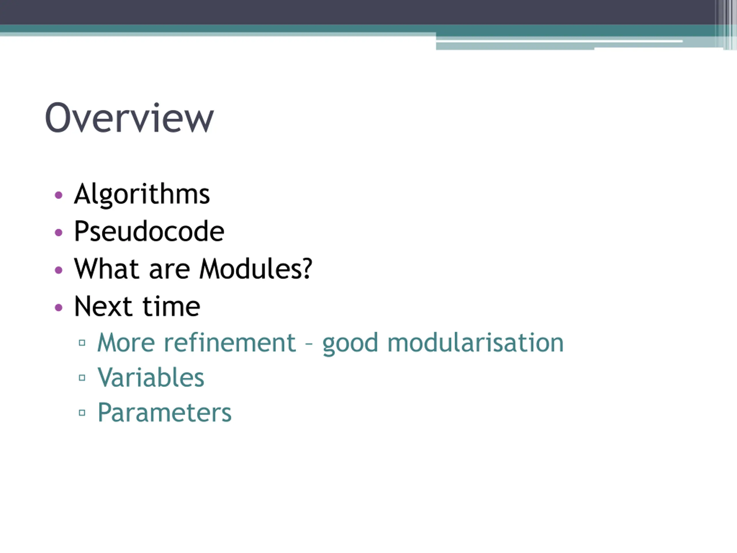 Overview Algorithms Pseudocode What are Modules? Next time More refinement good modularisation Variables Parameters