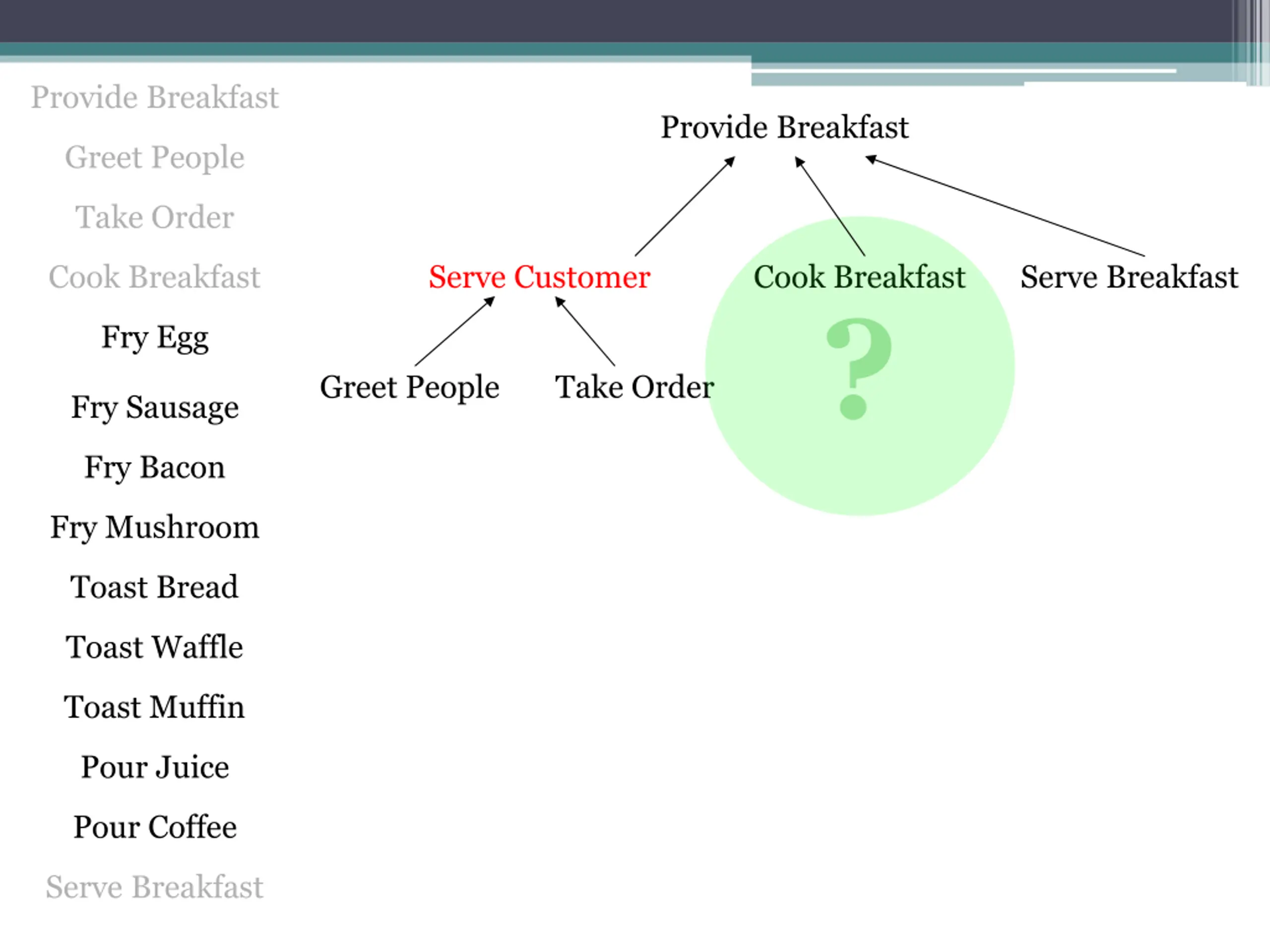 Provide Breakfast Provide Breakfast Greet People Take Order Cook Breakfast Serve Customer Cook Breakfast ? Serve Breakfast Fry Egg Greet People Take Order Fry Sausage Fry Bacon Fry Mushroom Toast Bread Toast Waffle Toast Muffin Pour Juice Pour Coffee Serve Breakfast