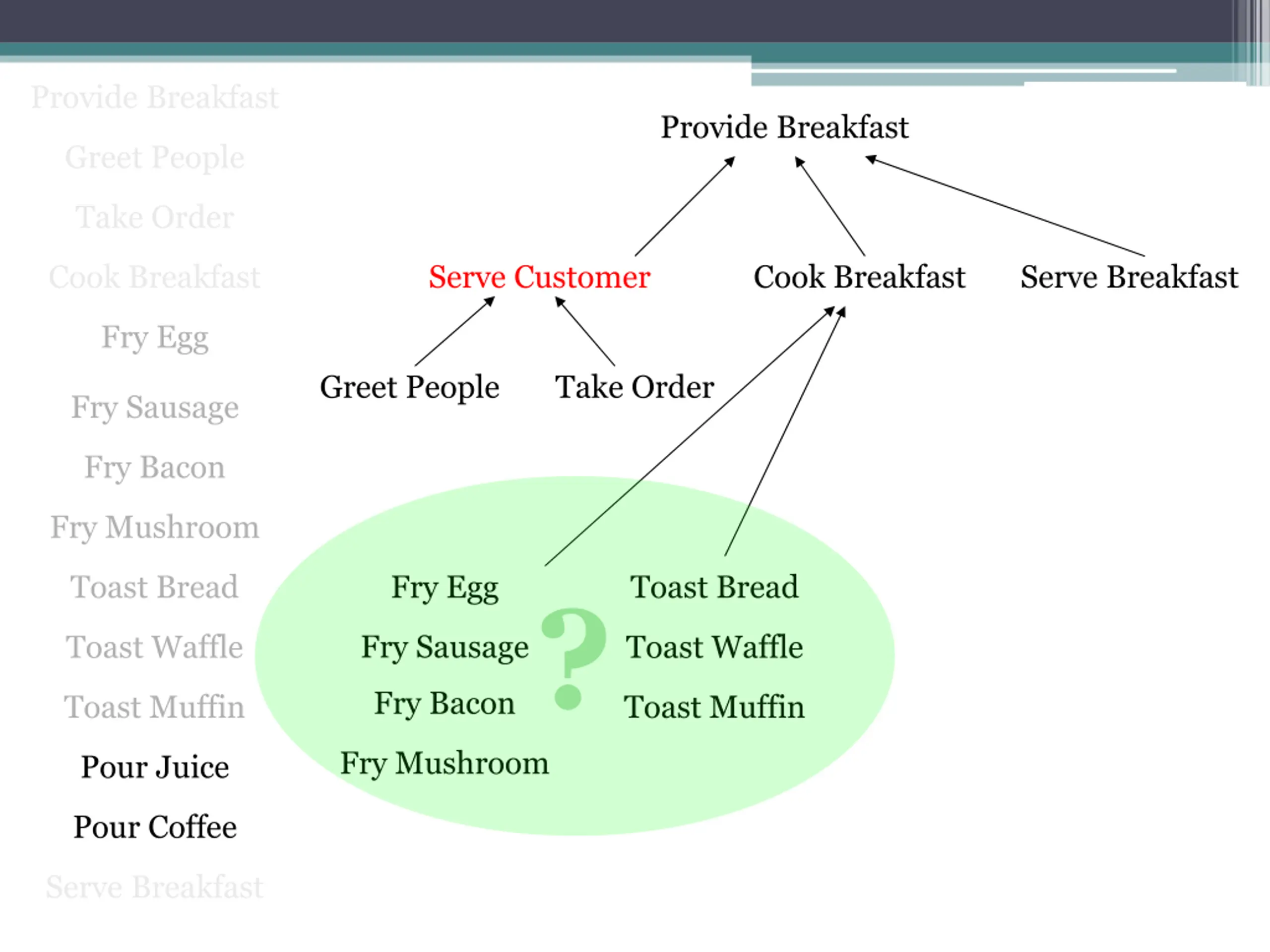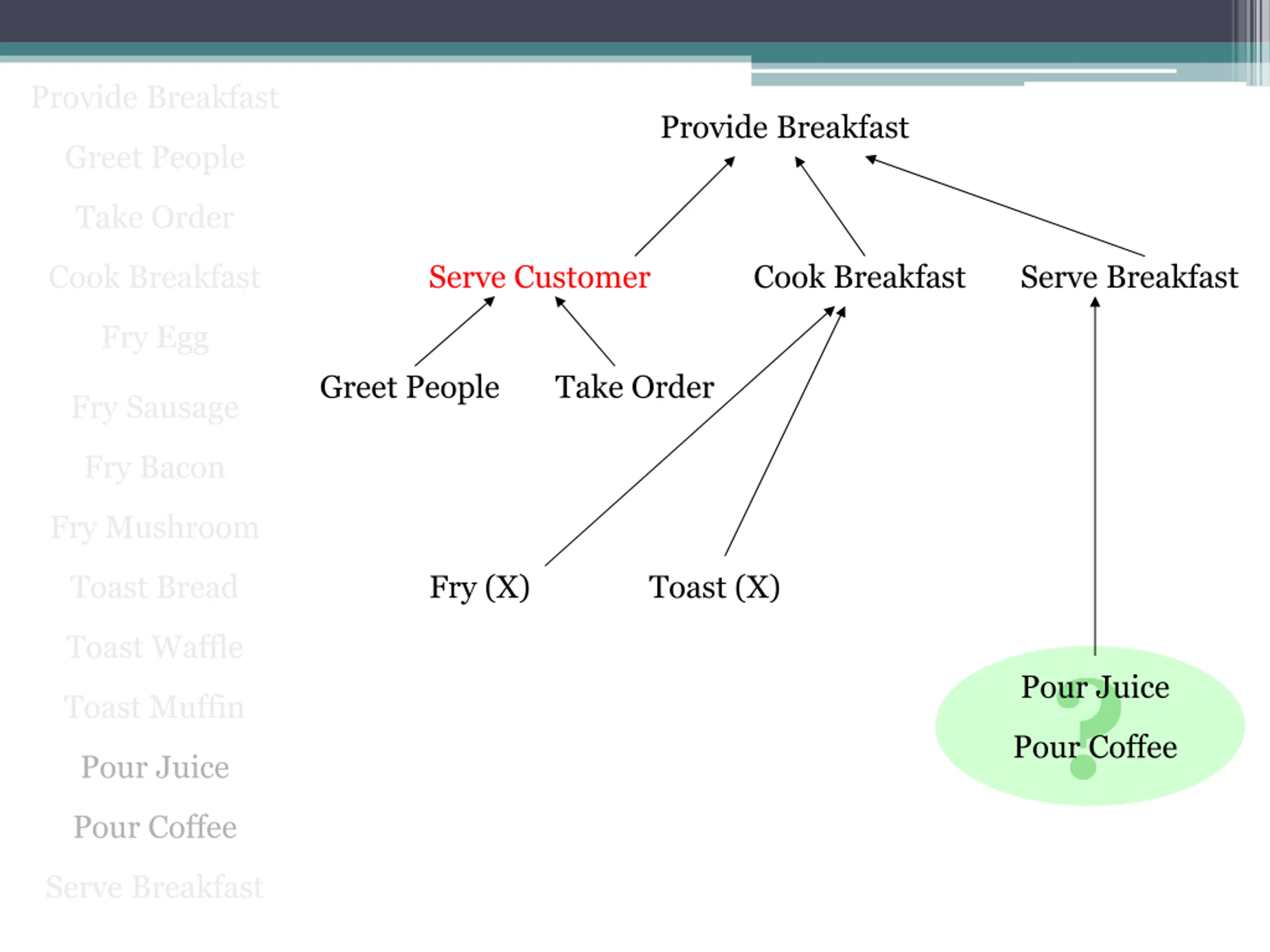 Provide Breakfast Provide Breakfast Greet People Take Order Cook Breakfast Serve Customer Cook Breakfast Serve Breakfast Fry Egg Greet People Take Order Fry Sausage Fry Bacon Fry Mushroom Toast Bread Fry Egg Toast Bread ? Fry Sausage Toast Waffle Toast Waffle Fry Bacon Toast Muffin Toast Muffin Fry Mushroom Pour Juice Pour Coffee Serve Breakfast