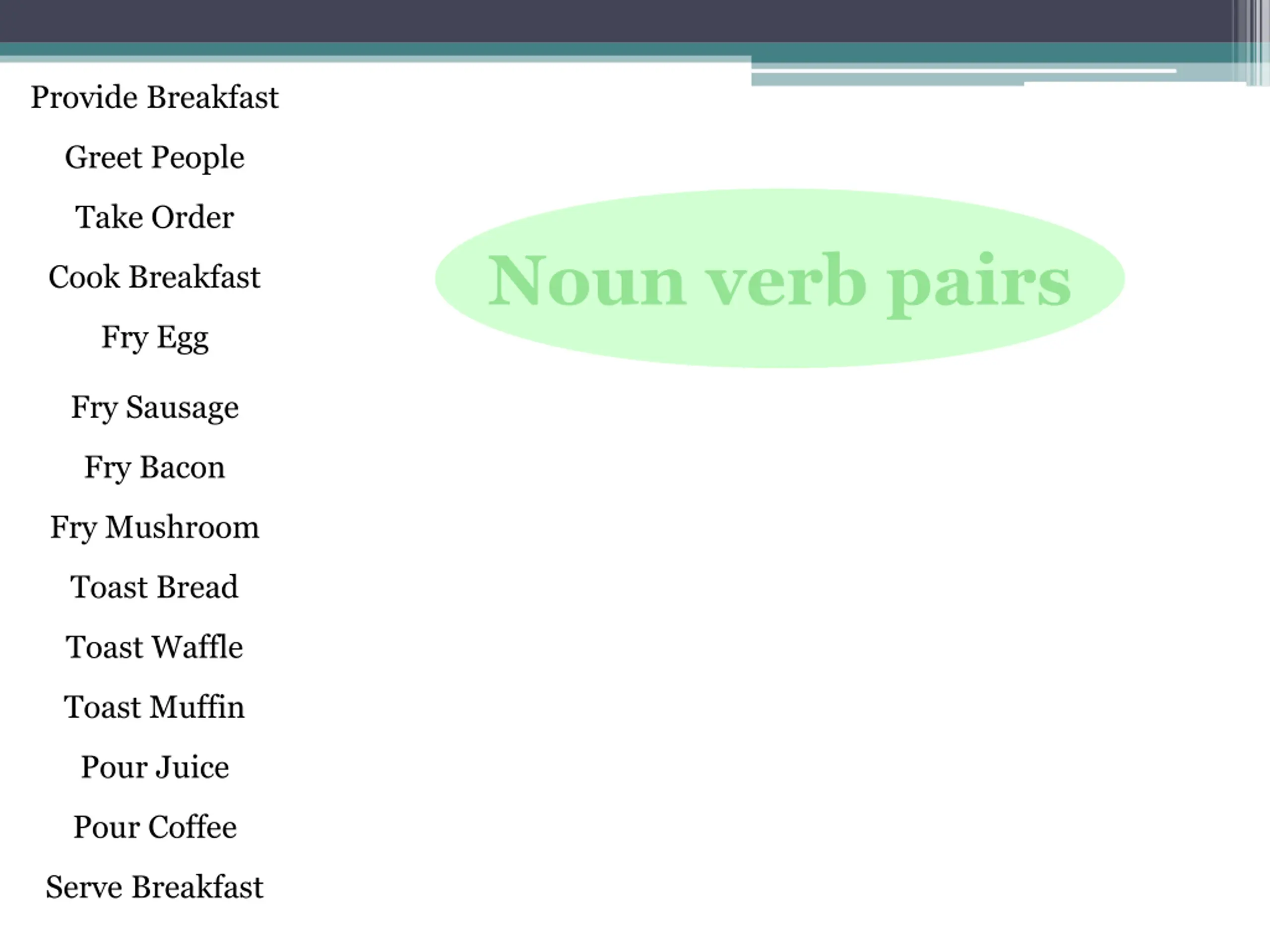 Provide Breakfast Greet People Take Order Noun verb pairs Cook Breakfast Fry Egg Fry Sausage Fry Bacon Fry Mushroom Toast Bread Toast Waffle Toast Muffin Pour Juice Pour Coffee Serve Breakfast