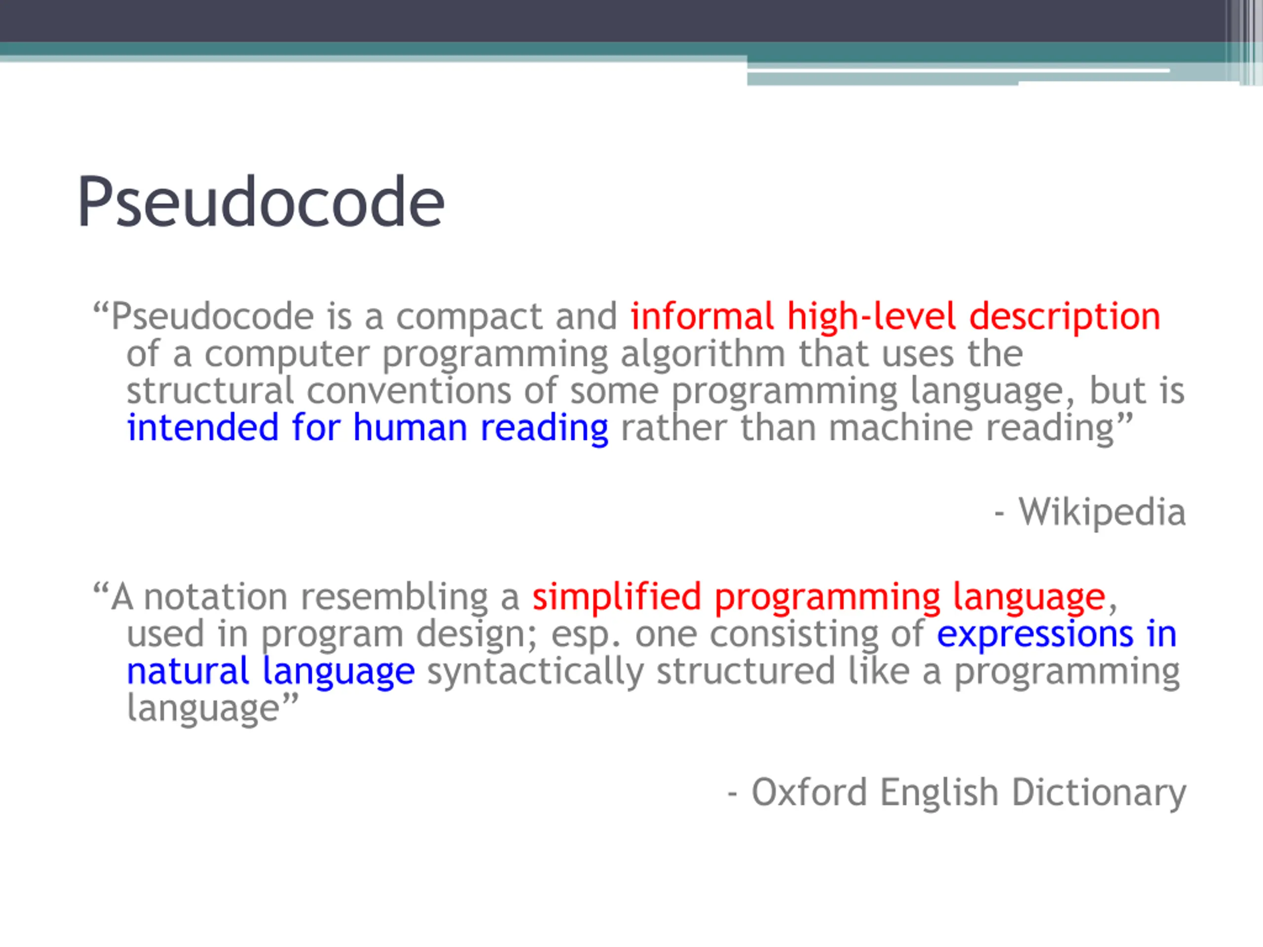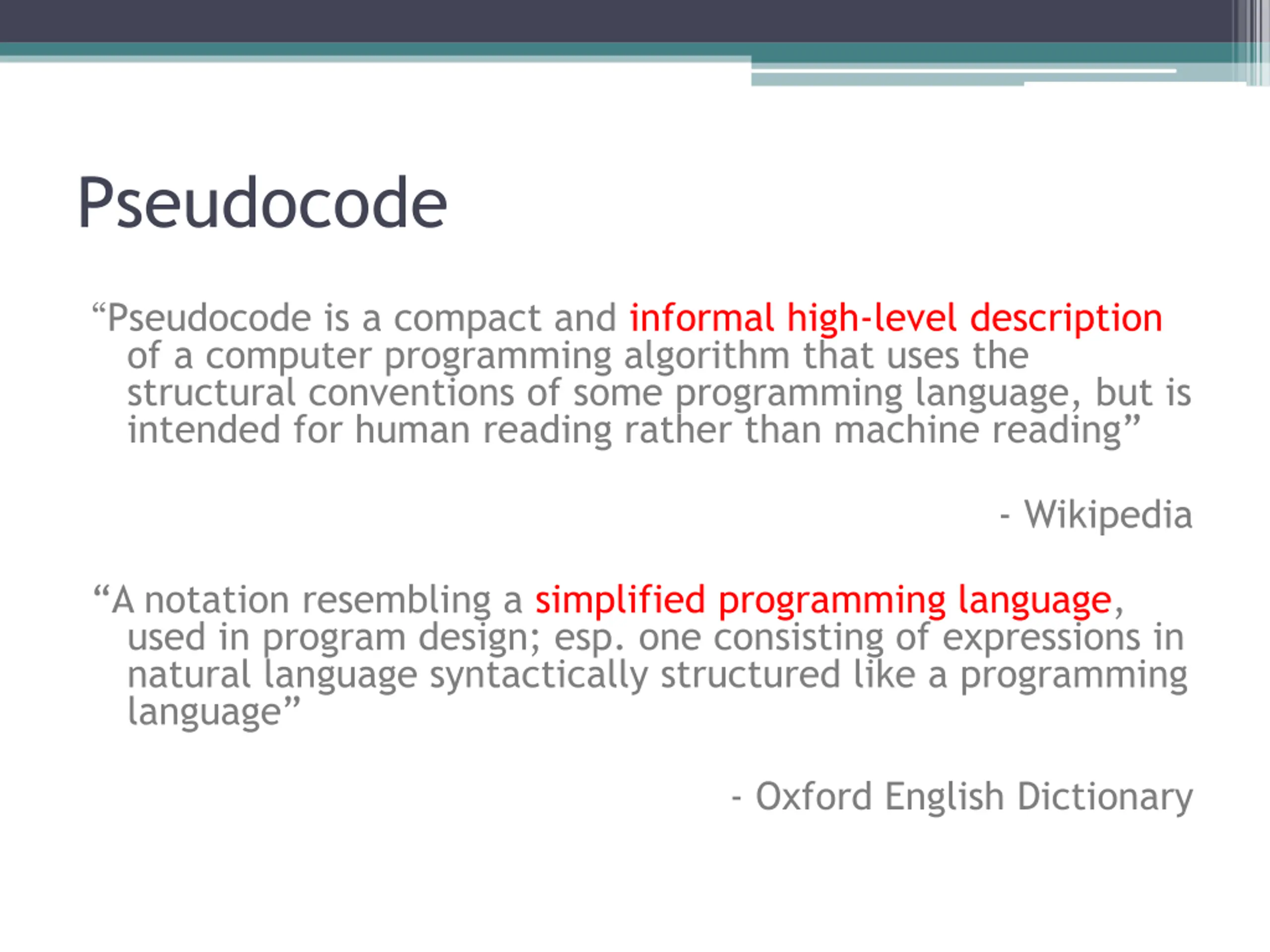 Pseudocode Pseudocode is a compact and informal high-level description of a computer programming algorithm that uses the structural conventions of some programming language, but is intended for human reading rather than machine reading - Wikipedia A notation resembling a simplified programming language, used in program design; esp. one consisting of expressions in natural language syntactically structured like a programming language - Oxford English Dictionary