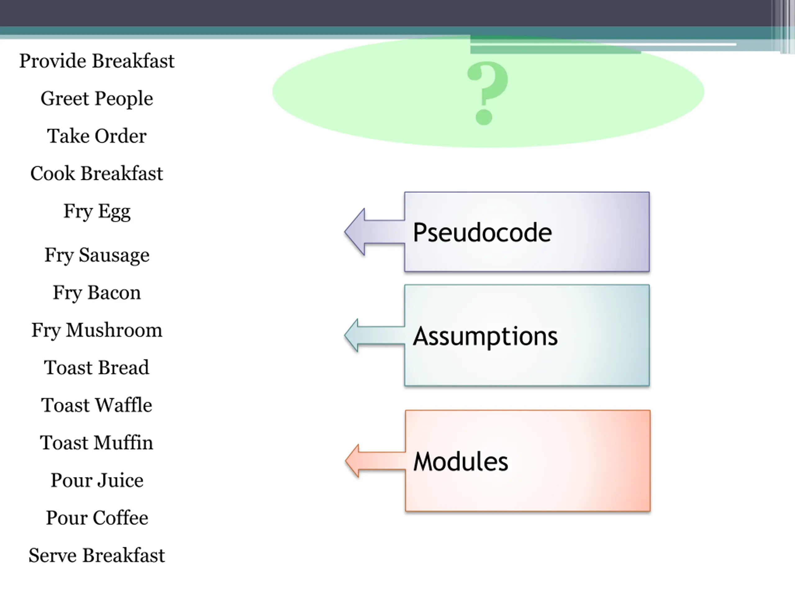 ? Provide Breakfast Greet People Take Order Cook Breakfast Fry Egg Pseudocode Fry Sausage Fry Bacon Fry Mushroom Assumptions Toast Bread Toast Waffle Toast Muffin Modules Pour Juice Pour Coffee Serve Breakfast