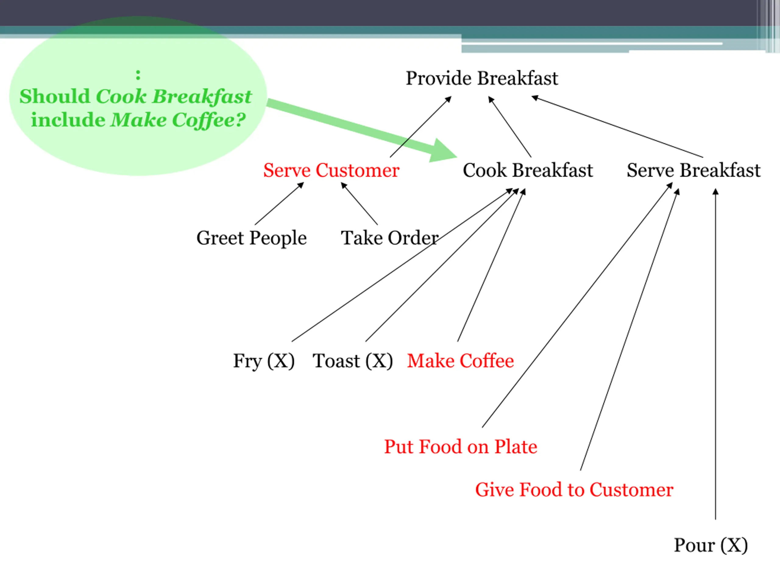 : Provide Breakfast Should Cook Breakfast include Make Coffee? Serve Customer Cook Breakfast Serve Breakfast Greet People Take Order Fry (X) Toast (X) Make Coffee Put Food on Plate Give Food to Customer Pour (X)