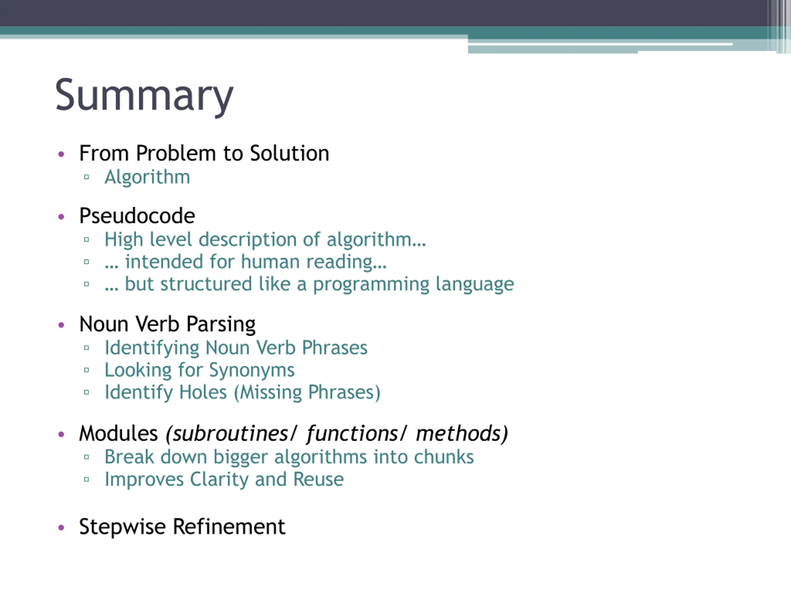 Summary From Problem to Solution Algorithm Pseudocode High level description of algorithm intended for human reading but structured like a programming language Noun Verb Parsing Identifying Noun Verb Phrases Looking for Synonyms Identify Holes (Missing Phrases) Modules (subroutines/ functions/ methods) Break down bigger algorithms into chunks Improves Clarity and Reuse Stepwise Refinement