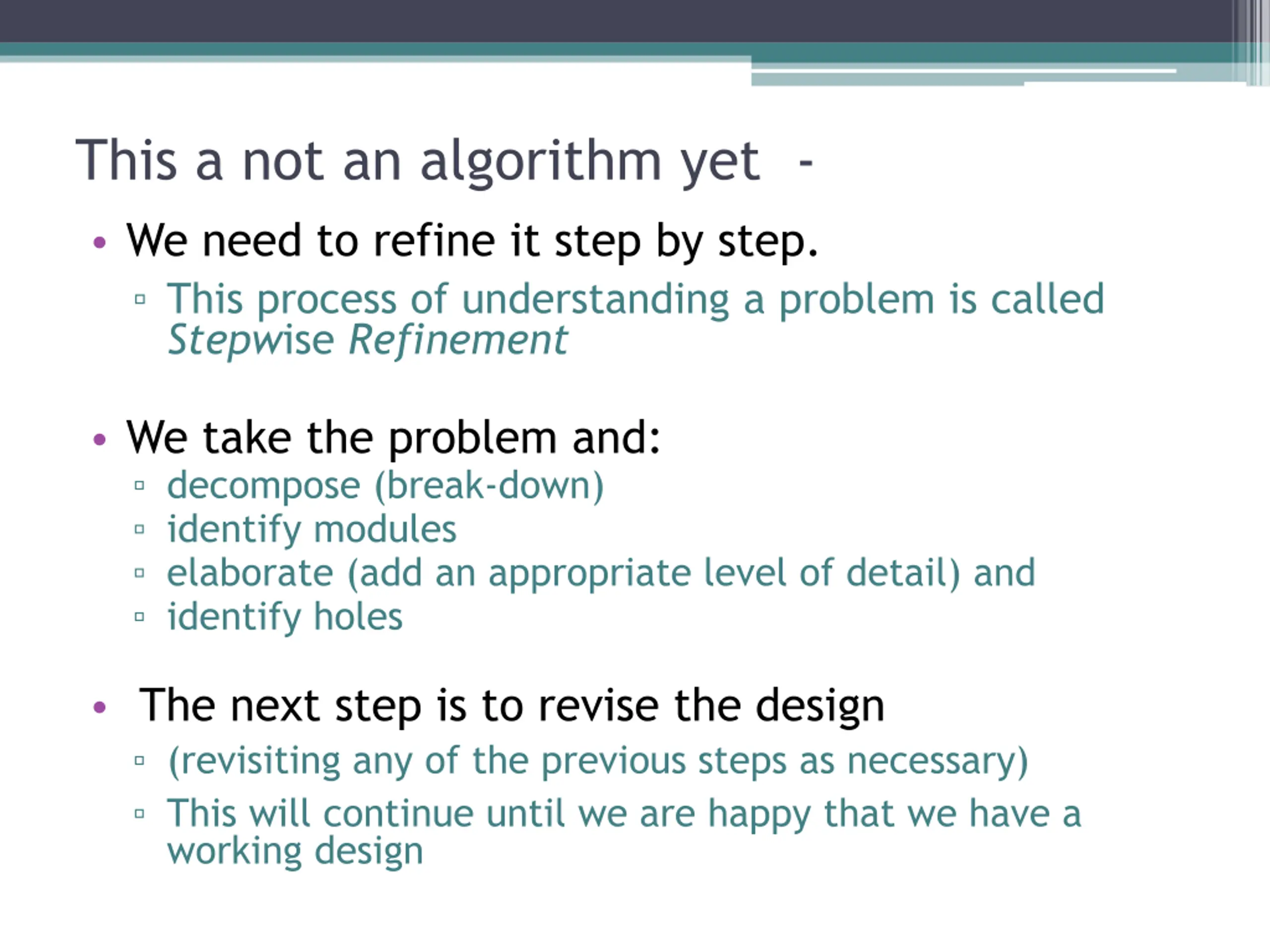 This a not an algorithm yet - We need to refine it step by step. This process of understanding a problem is called Stepwise Refinement We take the problem and: decompose (break-down) identify modules elaborate (add an appropriate level of detail) and identify holes The next step is to revise the design (revisiting any of the previous steps as necessary) This will continue until we are happy that we have a working design