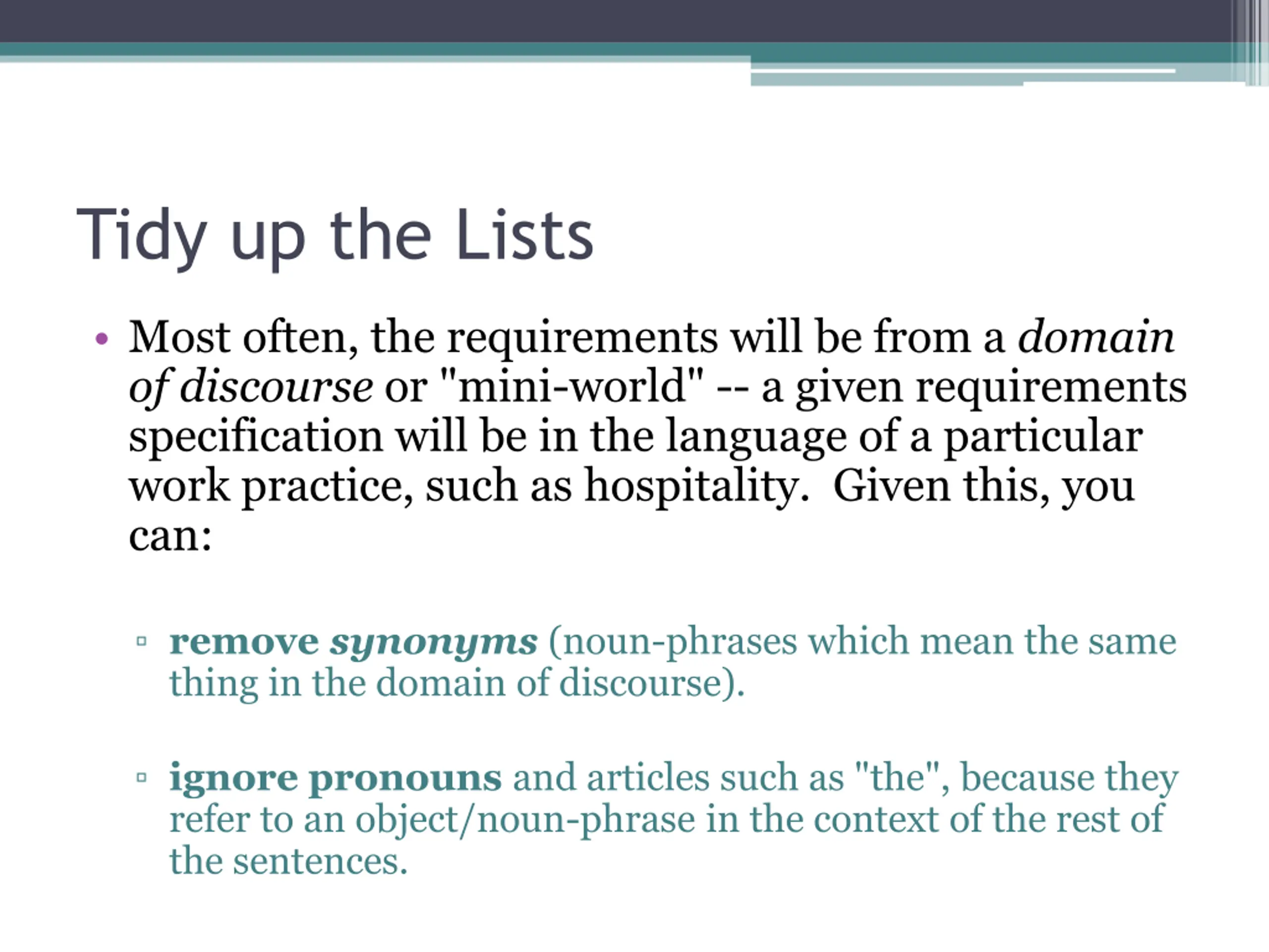Tidy up the Lists Most often, the requirements will be from a domain of discourse or "mini-world" -- a given requirements specification will be in the language of a particular work practice, such as hospitality. Given this, you can: remove synonyms (noun-phrases which mean the same thing in the domain of discourse). ignore pronouns and articles such as "the", because they refer to an object/noun-phrase in the context of the rest of the sentences.