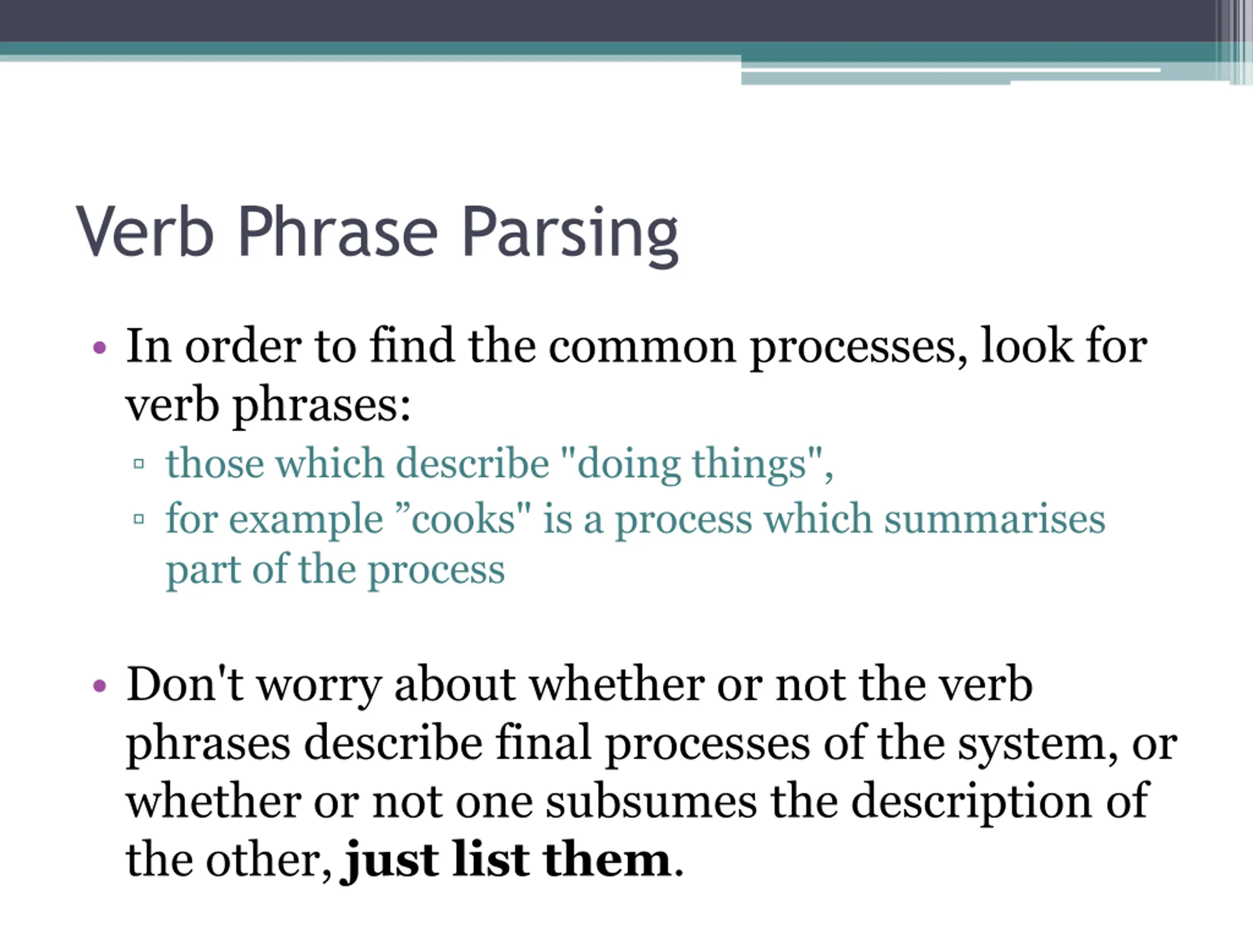 Verb Phrase Parsing In order to find the common processes, look for verb phrases: those which describe "doing things", for example cooks" is a process which summarises part of the process Don't worry about whether or not the verb phrases describe final processes of the system, or whether or not one subsumes the description of the other, just list them.