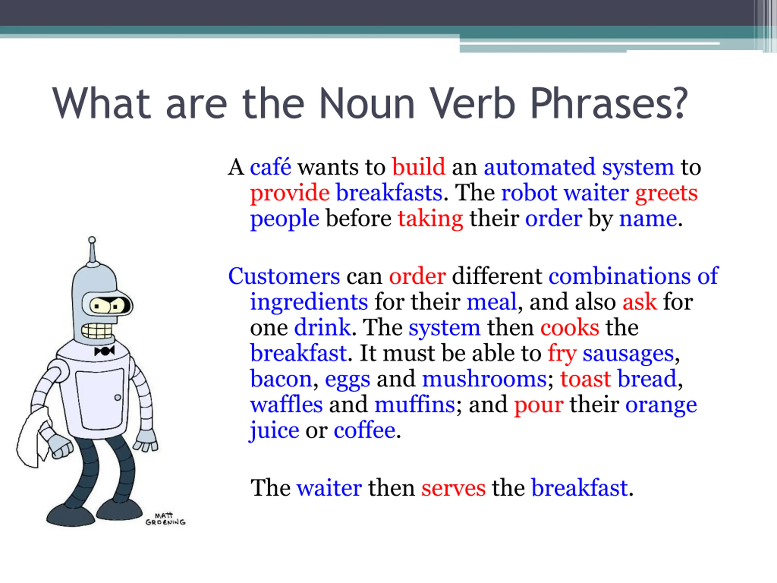 What are the Noun Verb Phrases? A caf wants to build an automated system to provide breakfasts. The robot waiter greets people before taking their order by name. Customers can order different combinations of ingredients for their meal, and also ask for one drink. The system then cooks the breakfast. It must be able to fry sausages, bacon, eggs and mushrooms; toast bread, waffles and muffins; and pour their orange juice or coffee. The waiter then serves the breakfast.