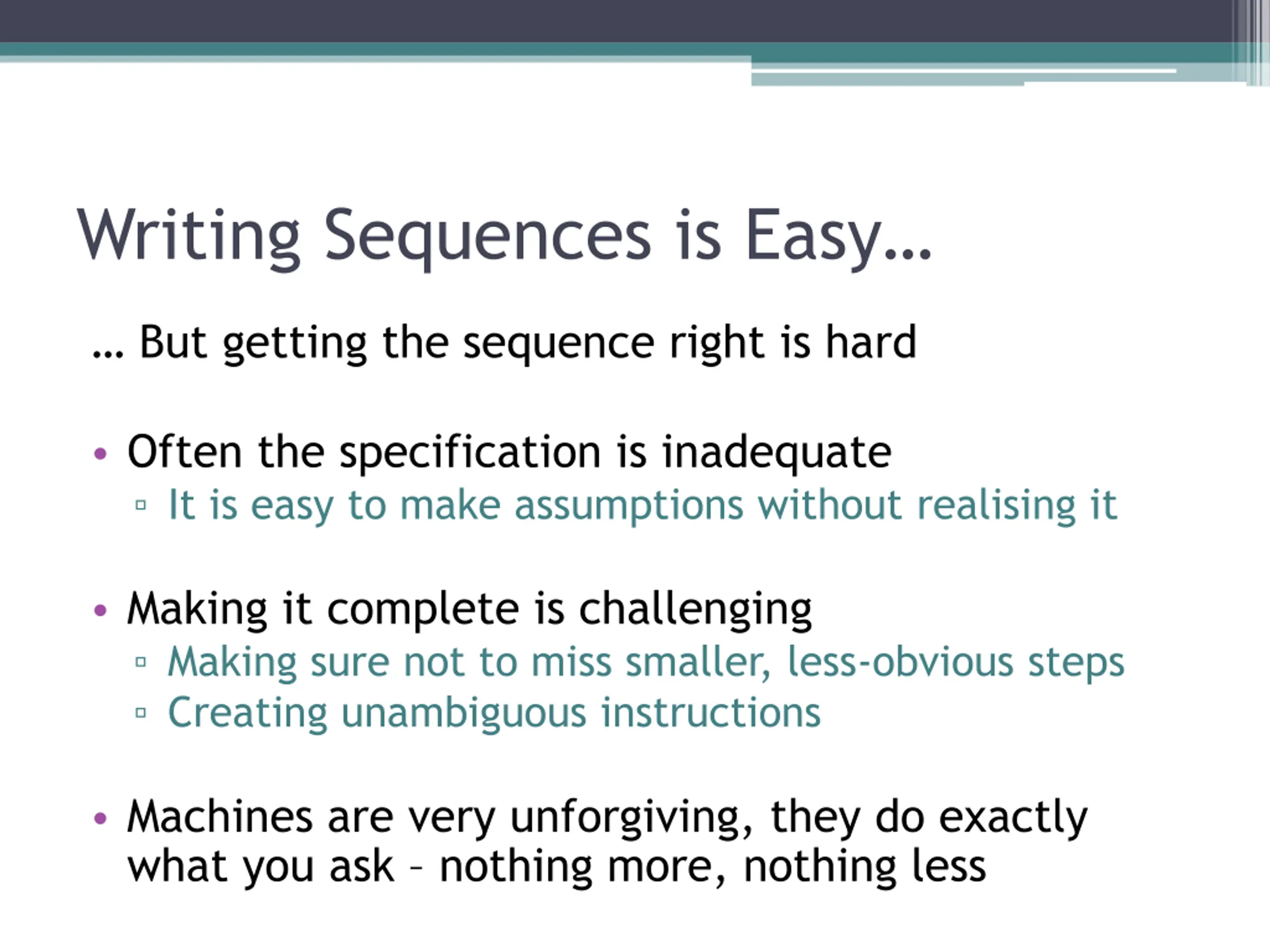 Writing Sequences is Easy But getting the sequence right is hard Often the specification is inadequate It is easy to make assumptions without realising it Making it complete is challenging Making sure not to miss smaller, less-obvious steps Creating unambiguous instructions Machines are very unforgiving, they do exactly what you ask nothing more, nothing less