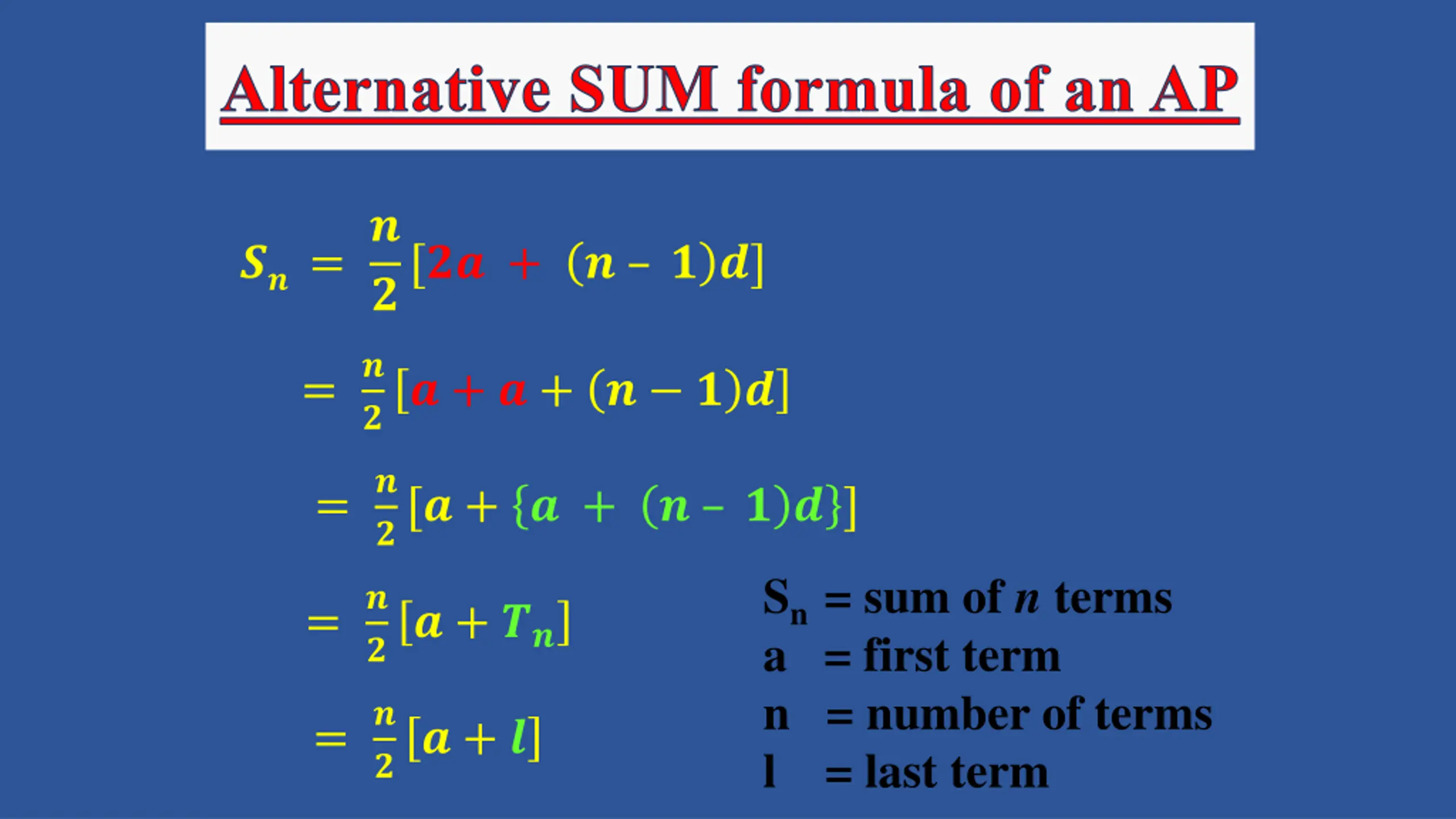 Alternative SUM formula of an AP ? ?[?? + ? ? ?] ?? = ? ?? + ? + ? ? ? = ? ?[? + ? + ? ? ? ] = Sn = sum of n terms a = first term n = number of terms l = last term ? ?? + ?? = ? ?? + ? =