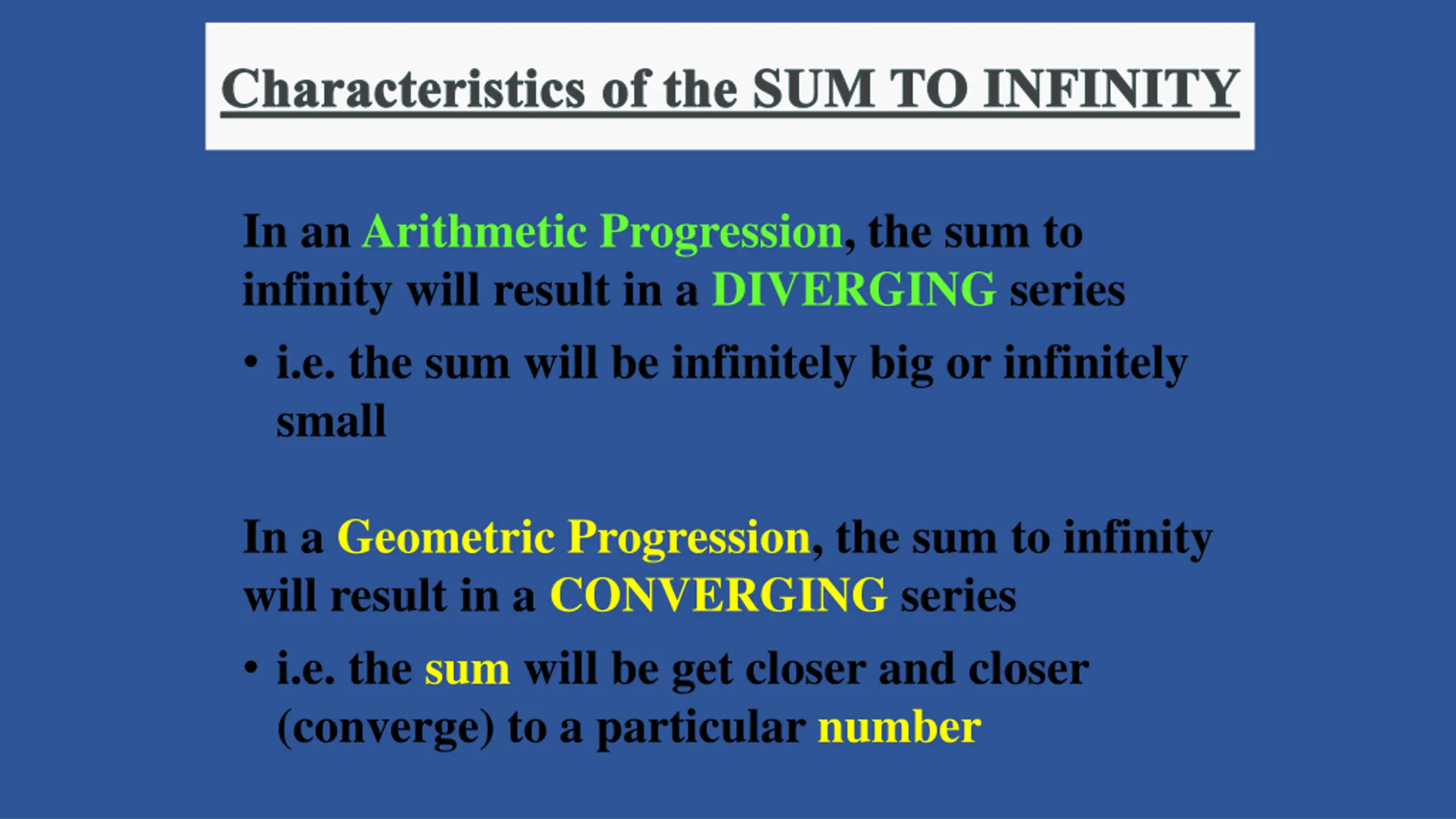 Characteristics of the SUM TO INFINITY In an Arithmetic Progression, the sum to infinity will result in a DIVERGING series i.e. the sum will be infinitely big or infinitely small In a Geometric Progression, the sum to infinity will result in a CONVERGING series i.e. the sum will be get closer and closer (converge) to a particular number
