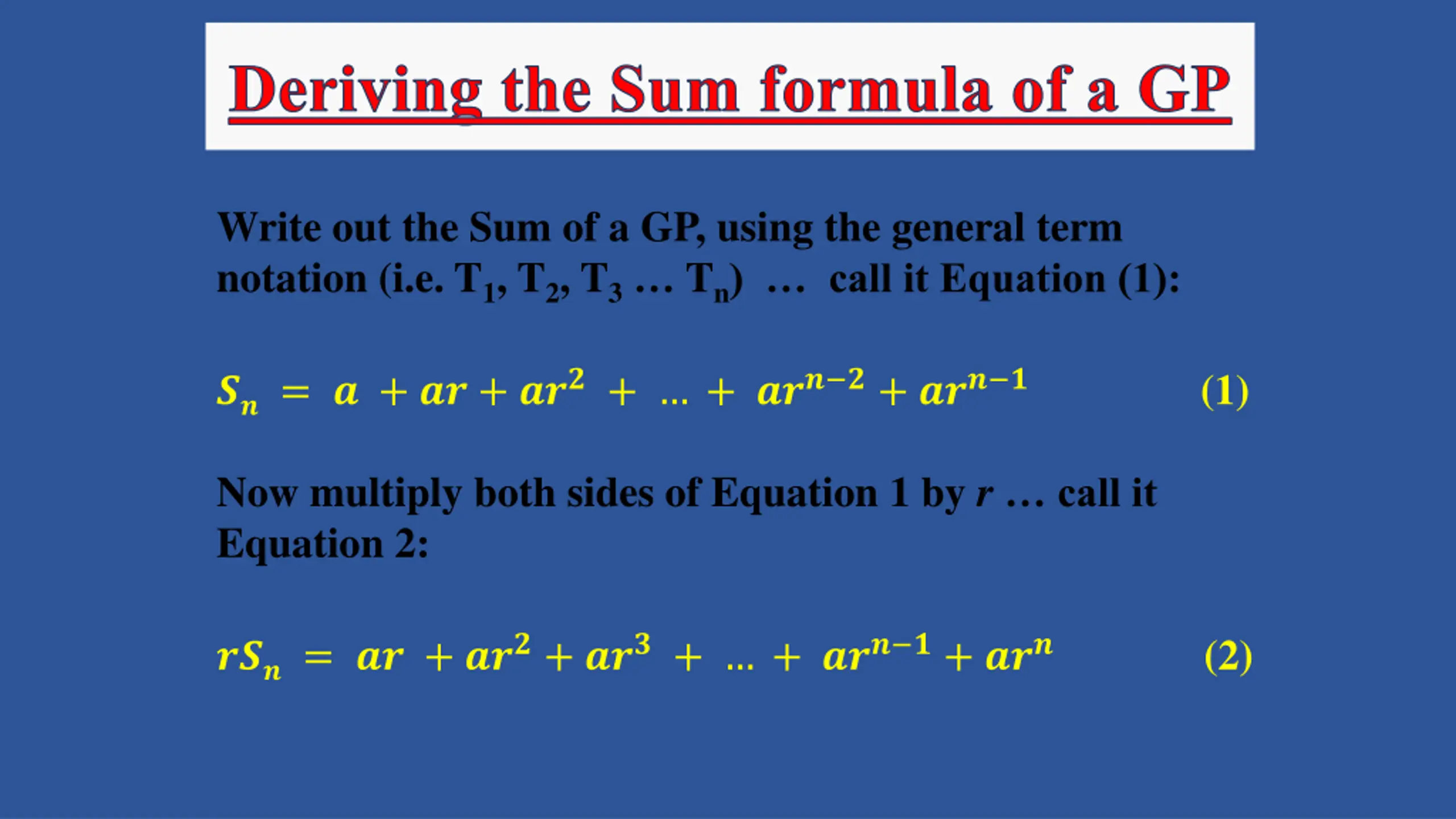 Deriving the Sum formula of a GP Write out the Sum of a GP, using the general term notation (i.e. T1, T2, T3 Tn) call it Equation (1): ?? = ? + ?? + ??? + + ??? ?+ ??? ? (1) Now multiply both sides of Equation 1 by r call it Equation 2: ??? = ?? + ???+ ??? + + ??? ?+ ??? (2)