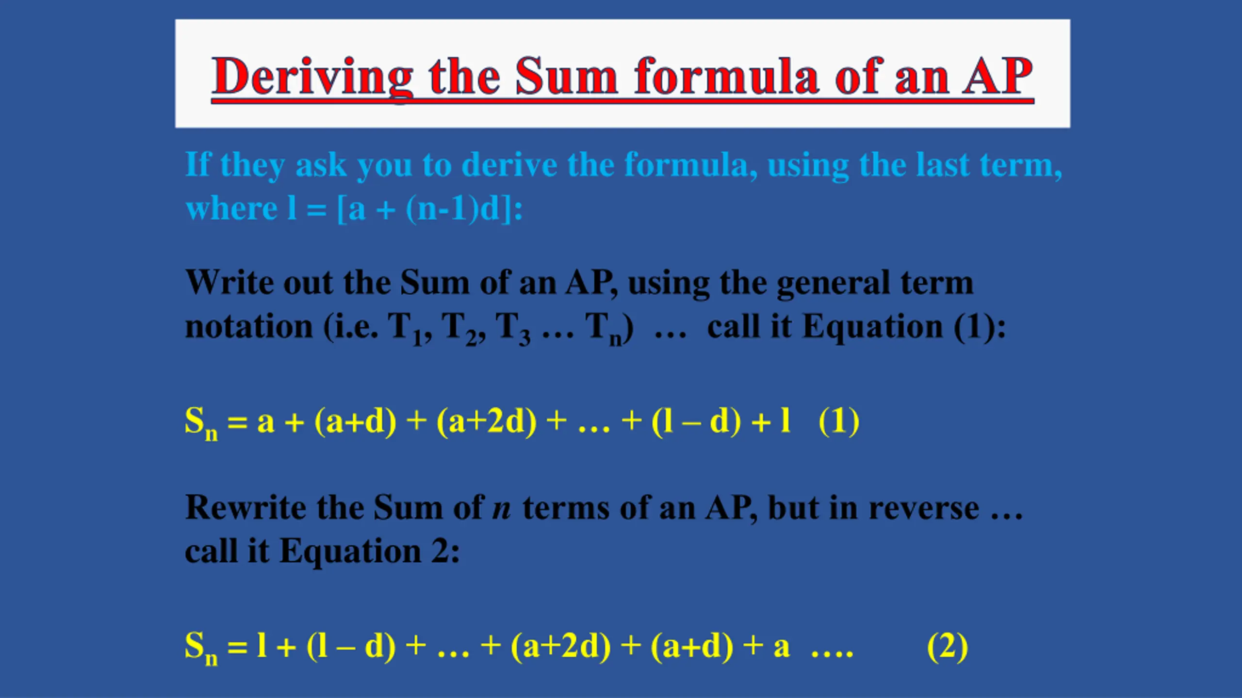 Deriving the Sum formula of an AP If they ask you to derive the formula, using the last term, where l = [a + (n-1)d]: Write out the Sum of an AP, using the general term notation (i.e. T1, T2, T3 Tn) call it Equation (1): Sn = a + (a+d) + (a+2d) + + (l d) + l (1) Rewrite the Sum of n terms of an AP, but in reverse call it Equation 2: Sn = l + (l d) + + (a+2d) + (a+d) + a . (2)