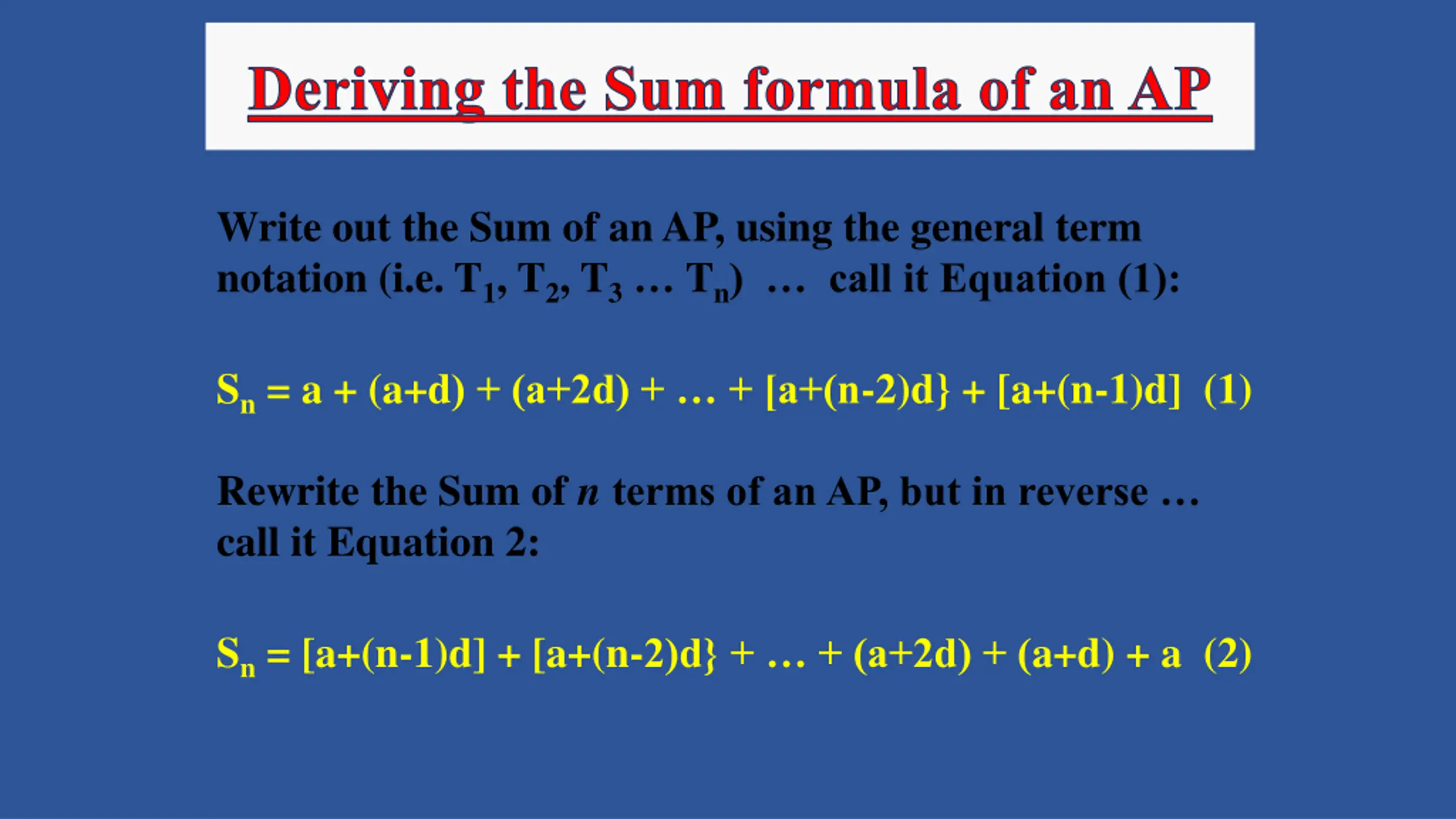 Deriving the Sum formula of an AP Write out the Sum of an AP, using the general term notation (i.e. T1, T2, T3 Tn) call it Equation (1): Sn = a + (a+d) + (a+2d) + + [a+(n-2)d} + [a+(n-1)d] (1) Rewrite the Sum of n terms of an AP, but in reverse call it Equation 2: Sn = [a+(n-1)d] + [a+(n-2)d} + + (a+2d) + (a+d) + a (2)