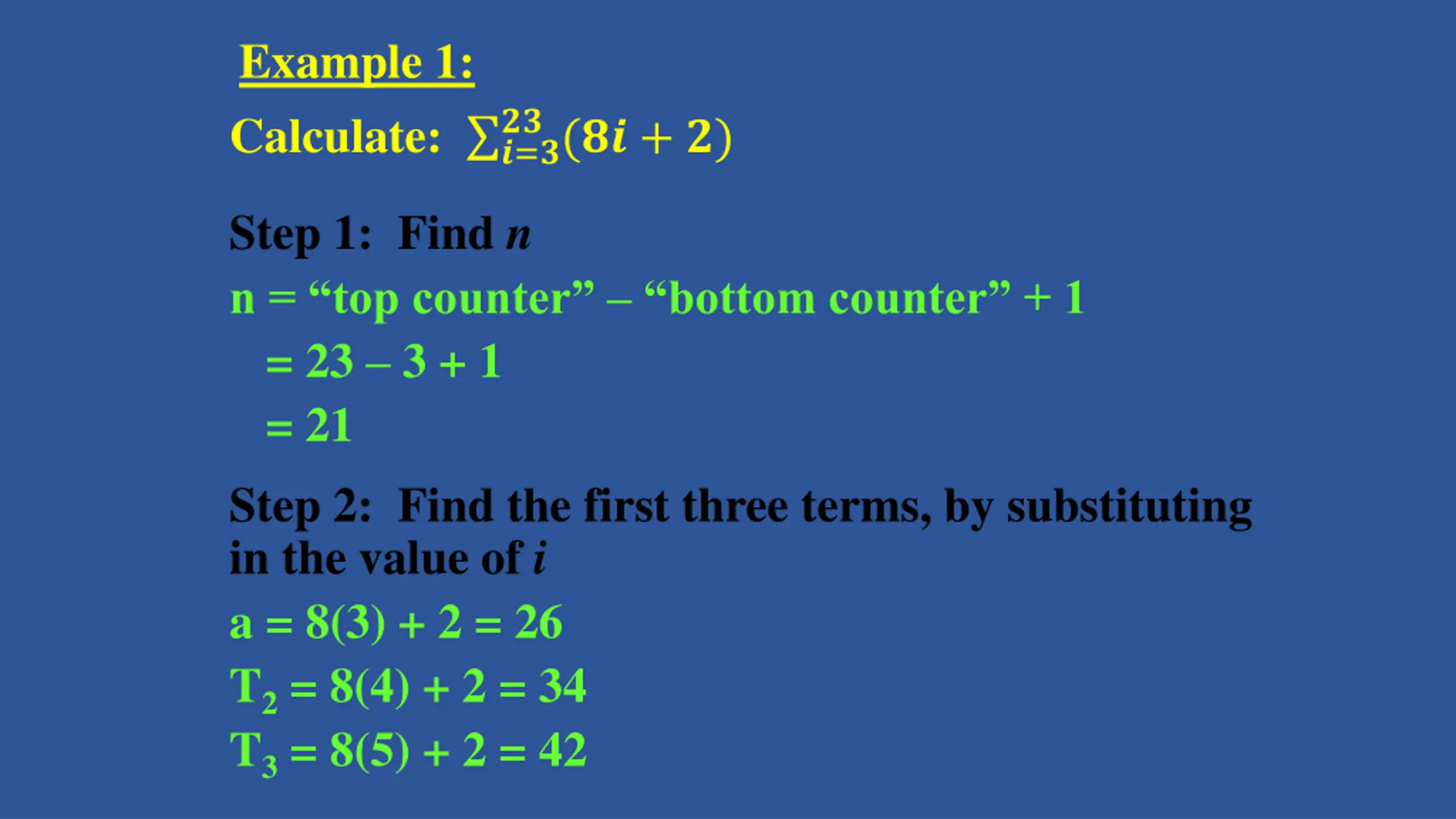 Example 1: Calculate: ?=? ??(?? + ?) Step 1: Find n n = top counter bottom counter + 1 = 23 3 + 1 = 21 Step 2: Find the first three terms, by substituting in the value of i a = 8(3) + 2 = 26 T2 = 8(4) + 2 = 34 T3 = 8(5) + 2 = 42
