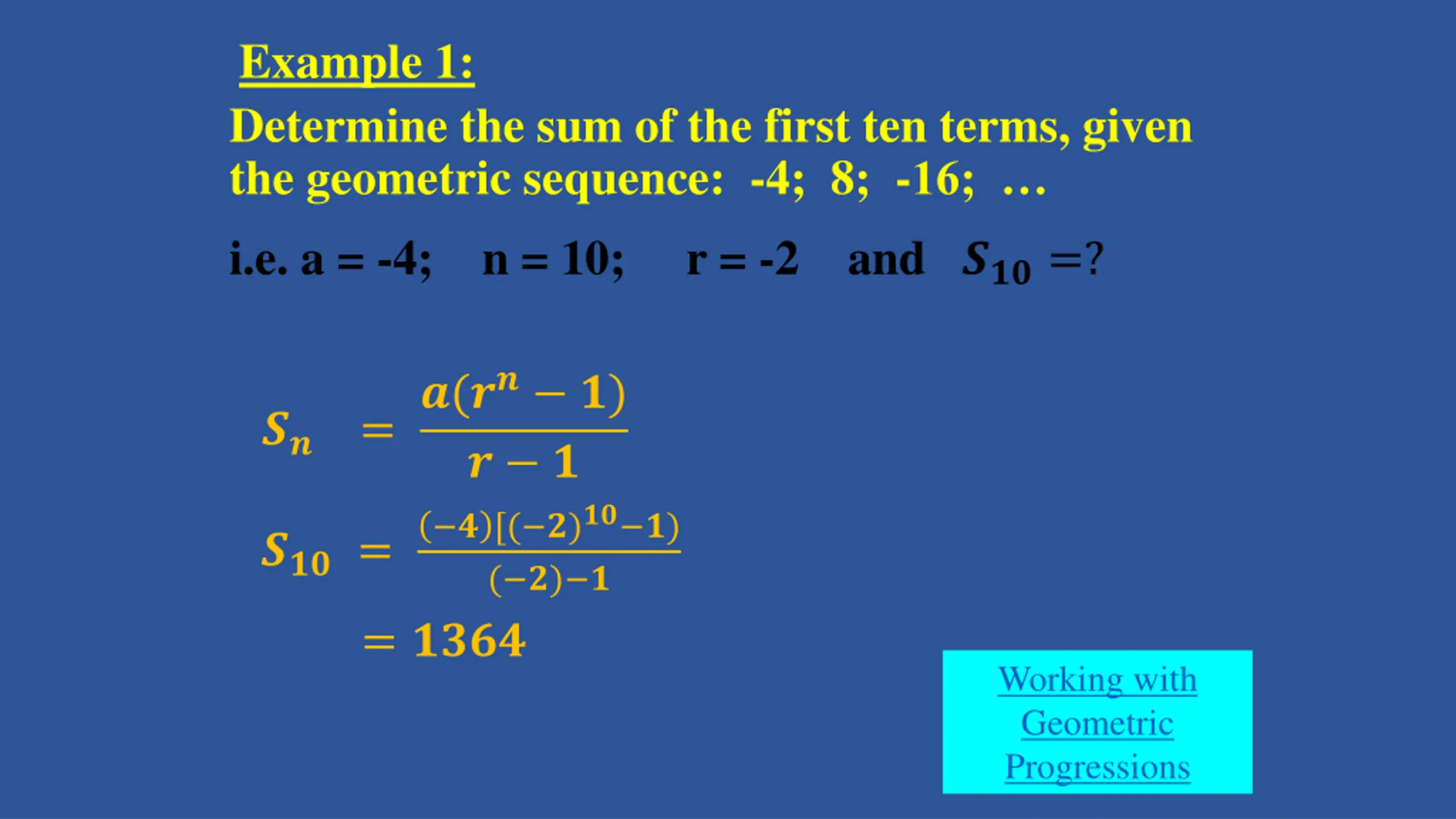 Example 1: Determine the sum of the first ten terms, given the geometric sequence: -4; 8; -16; i.e. a = -4; n = 10; r = -2 and ???=? ?(?? ?) ? ? ? [( ?)?? ?) ( ?) ? ?? = ??? = = ???? Working with Geometric Progressions
