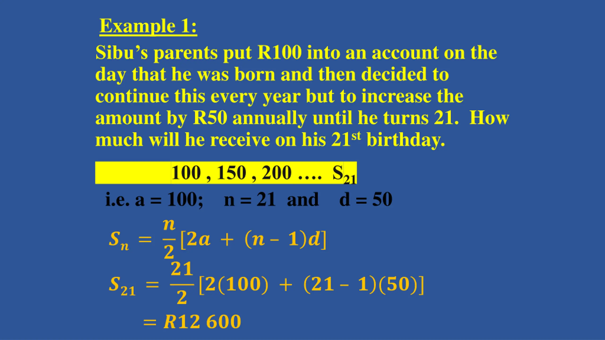 Example 1: Sibu s parents put R100 into an account on the day that he was born and then decided to continue this every year but to increase the amount by R50 annually until he turns 21. How much will he receive on his 21st birthday. 100 , 150 , 200 . S21 i.e. a = 100; n = 21 and d = 50 ? ?[?? + ? ? ?] ?? ?[?(???) + ?? ? (??)] = ??? ??? ?? = ??? =
