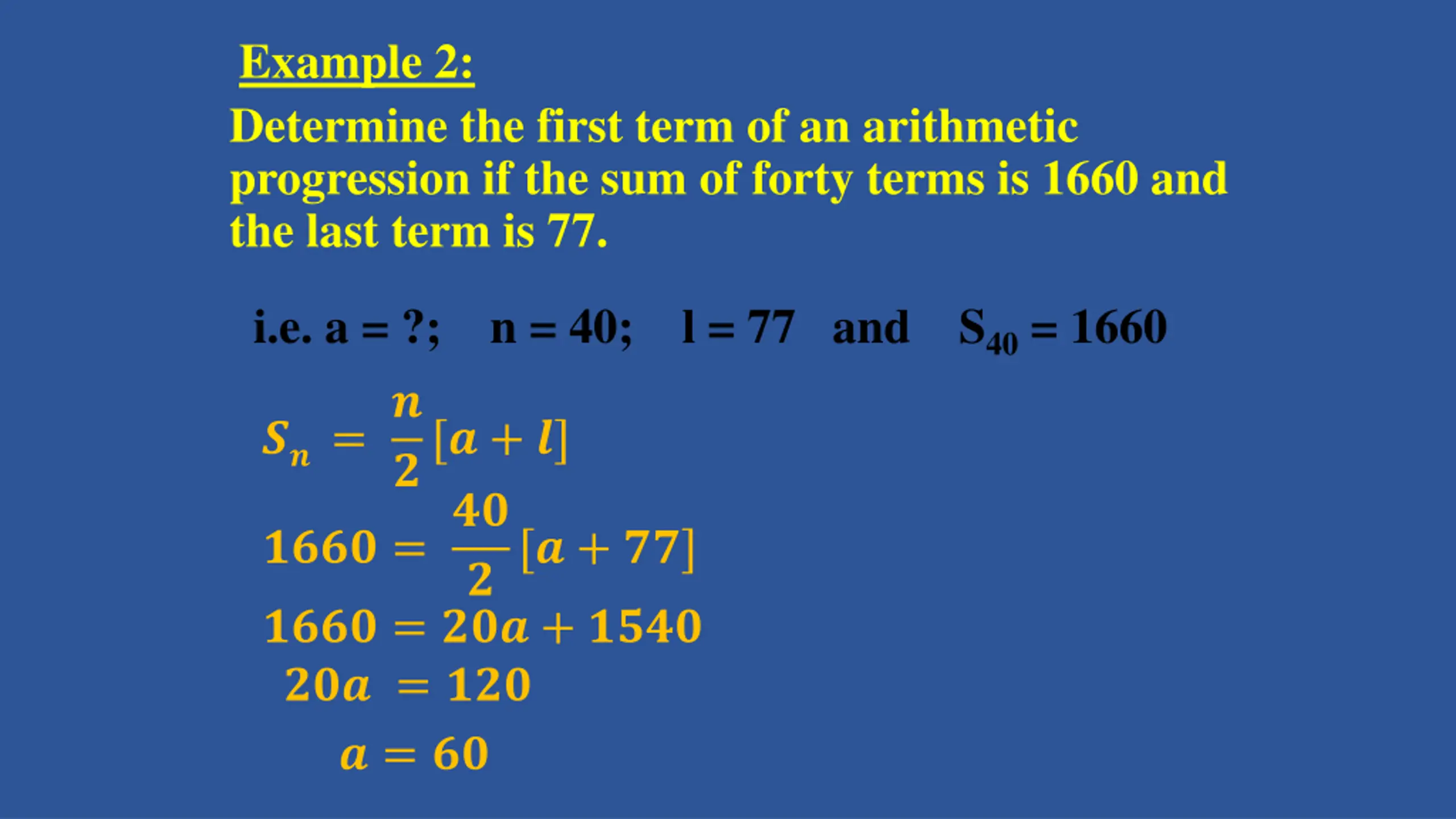 Example 2: Determine the first term of an arithmetic progression if the sum of forty terms is 1660 and the last term is 77. i.e. a = ?; n = 40; l = 77 and S40 = 1660 ? ?[? + ?] ?? ?[? + ??] ???? = ??? + ???? ??? = ??? ? = ?? ?? = ???? =