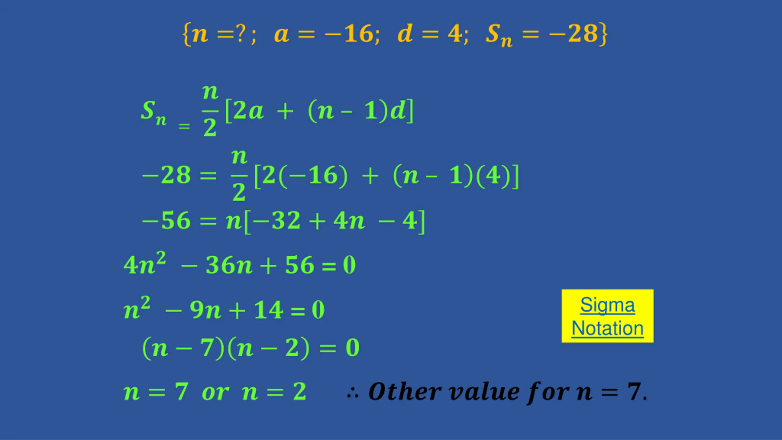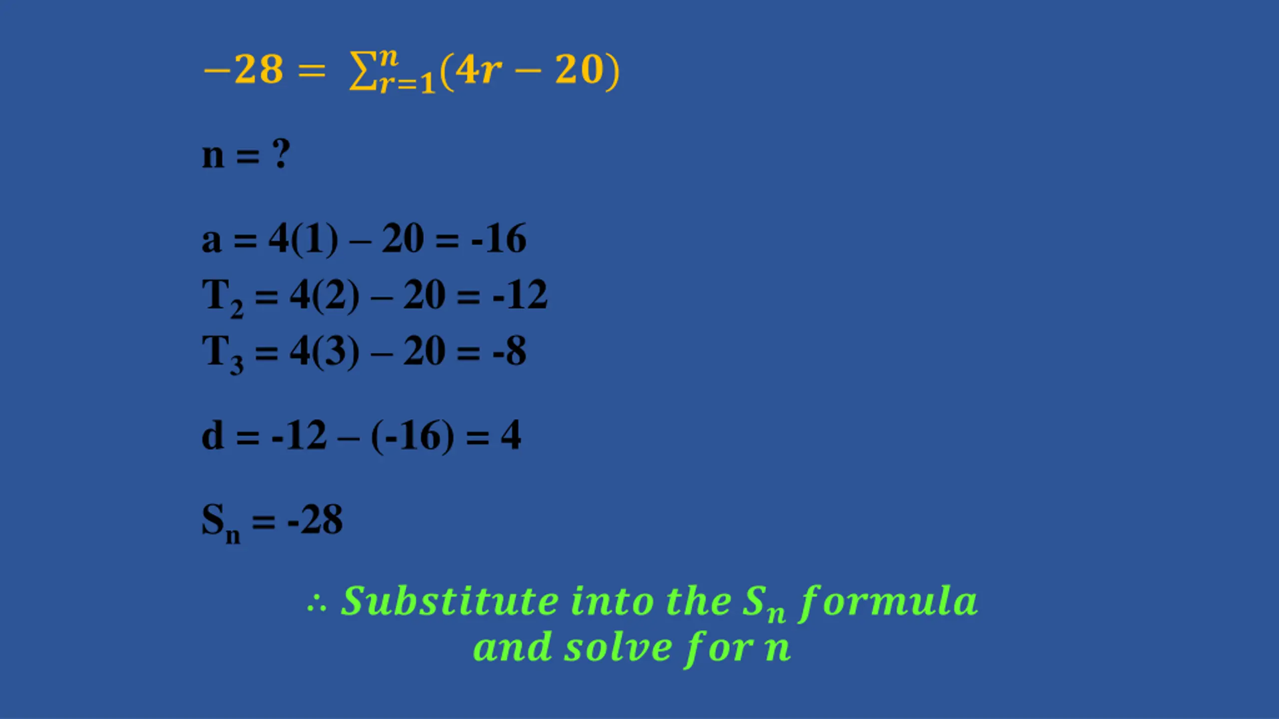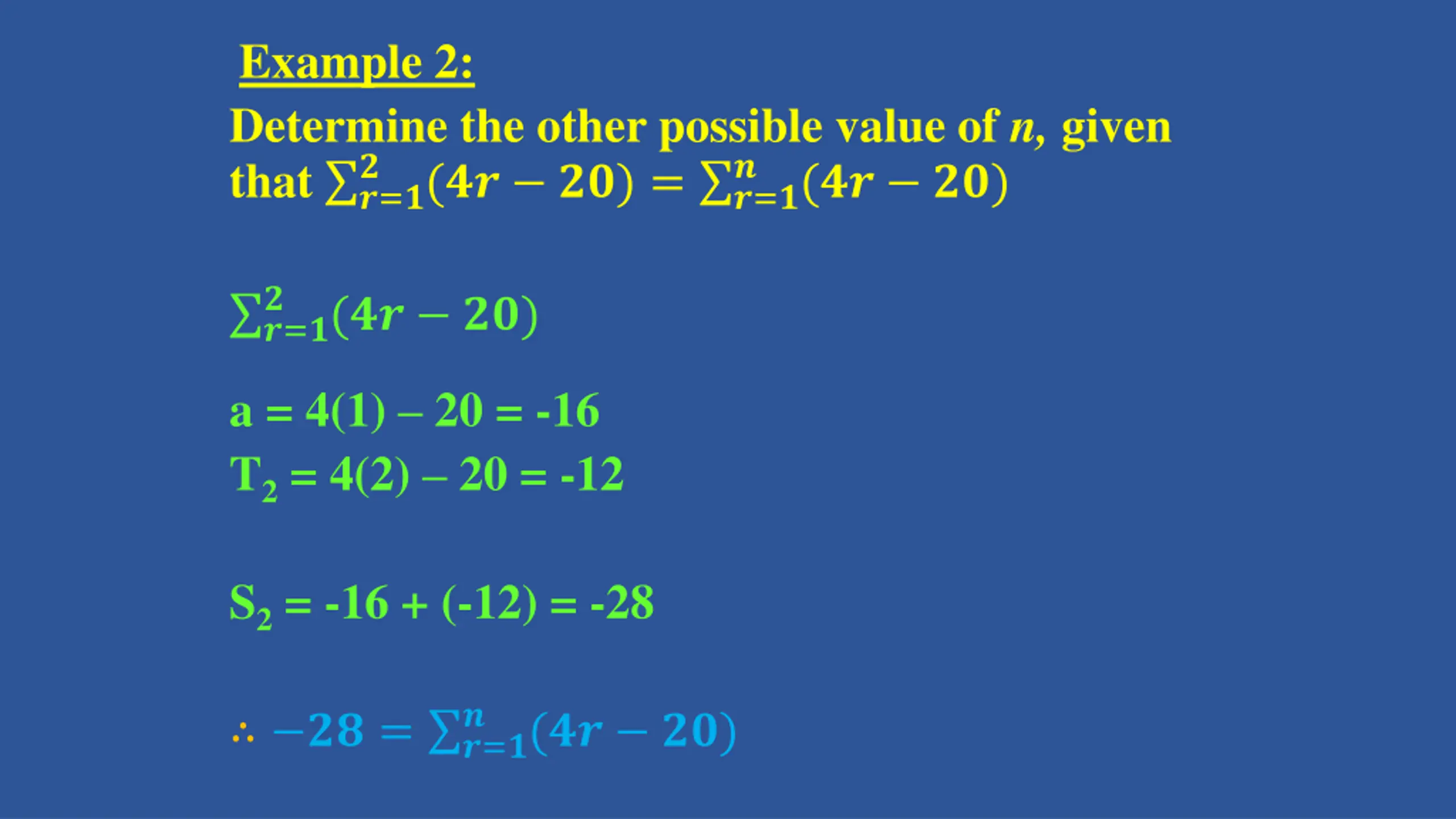 Example 2: Determine the other possible value of n, given that ?=? (?? ??) = ?=? ?=? (?? ??) ? ? (?? ??) ? a = 4(1) 20 = -16 T2 = 4(2) 20 = -12 S2 = -16 + (-12) = -28 ? ?? = ?=? (?? ??)